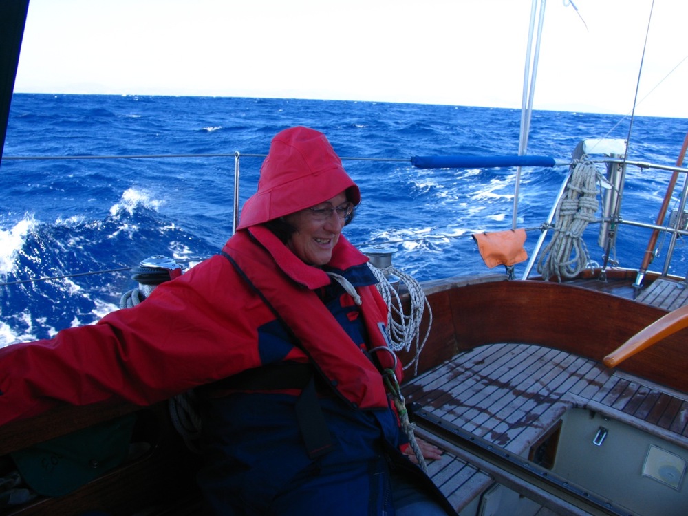 11 Uhr: Leinen los und Kurs zur Südspitze der Insel. Das geht fein mit 2 Reffs und Rückenwind. Um 14 Uhr nähern wir uns der Südspitze, Kap Mastikho. Der Wind schwächelt und wir nehmen den Motor zur Hilfe. Gerdi richtet Brote und Tomaten, dazu „Effes Dark“, würziges türkisches dunkles Bier. Wir ändern den Kurs auf die Nordseite der Insel Andros, Kompasskurs 260°. Leider hält sich der Wind in Stärke und Richtung nicht an die Vorhersagen, wir können den Kurs nicht halten. Bis 14 Uhr legt der Wind noch zu und macht auch 2 Reffs im Vorsegel nötig, dennoch fährt EOS mit 5 Knoten. Ich rechne mit einem Abflauen am Abend. Doch das erfüllt sich nicht. Längst haben wir Ölzeug und Schwimmwesten angelegt und bei der Fahrt gegen Wind besuchen immer wieder Wellen unser Cockpit. Es ist ungemütlich.