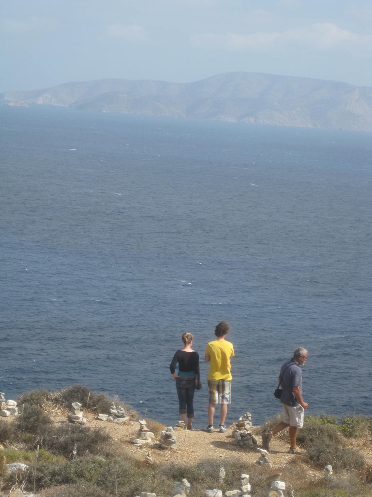 d wüten, wir genießen von oben prachtvolle Ausblicke über Felsenketten und blaues, gischtweiß gesprenkeltes Meer ringsum. Ein Pfad mit unzähligen „Steinmännle“ führt uns zu „Homers Grab“! Im 5,Jh.v.Chr. schrieb Herodot, dass hier das Haupt des edlen Dichters ruht.