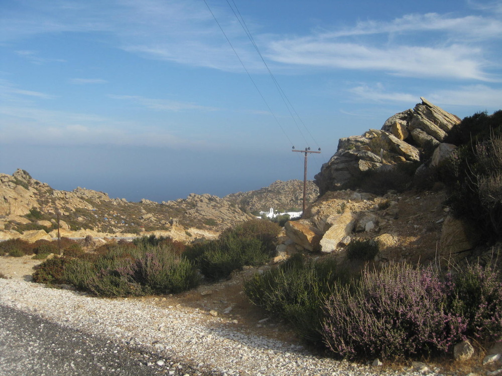 Die Insel ist ein Stein-Meer. Wild, fast wüstenhaft und vegetationslos, kein Busch, kein Baum, nur an der Straße künstlich angepflanzte, mit Drahtgitter geschützte Jungbäume, Zypressen. Bizarre Felsformen, wie Ungeheuer, wie Skelette, wie meterhohe Tierschädel in den Himmel ragend, von Erosion und starken Winden verformt, wie zerfetzt. Mittendrin ein schneeweißes Kloster, im Klostergarten Blumen und Bäume, Oleander, Rosen, Bougainvillea! Kleine Zellen, die Türen mit Vorhängeschloß versperrt, Fliegengitter vor offenen Fensterchen, durch die man die golden strahlende Monstranz im Kirchlein glänzen sieht. Feuerstellen, Waschbecken, Steintische und –bänke im Garten, die bei Festen wohl für 150 orthodoxe Gläubige Platz und Mahl bieten. Eine Zisterne daneben. Erika-farben leuchtet blühendes Heidekraut am Wegrand, zahllose Imkerkästen für die Bienen.