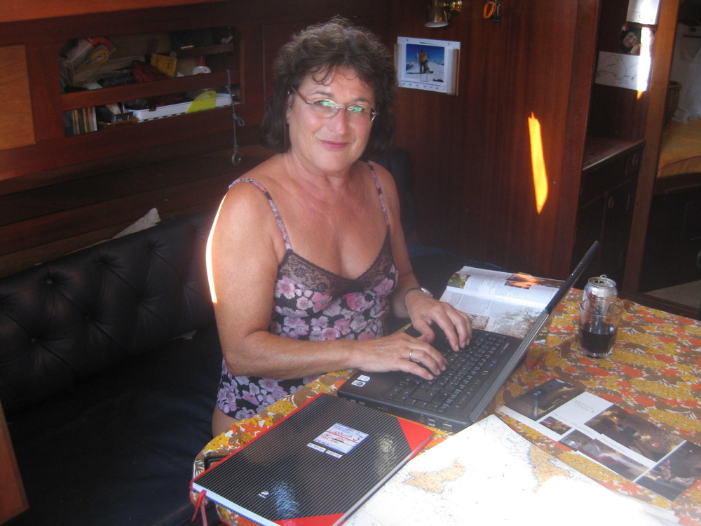 Ich will für Luci und Martin Zucchini-Küchlein backen, mische 6 Eier, Milch, Mehl, Pfefferminze, Zucker. Als ich aber den Schöpflöffel eintauche und das Öl schon in der Pfanne brutzelt, höre ich, dass Gerhard mit einem Gulet-Kapitän debattiert. Der hat seine 2 schweren Anker über unsere Heckanker-Kette geworfen, über Kreuz! Der Berufskäptn‘ gibt nicht nach, seine amerikanischen Gäste wollen nun auf weißem Damast tafeln, Dinner! Gerhard bittet, dass er früh um 8 „Anker-auf gehen“ soll, weil wir die EOS im kleinen Hafen an eine Mooring legen wollen. Es droht 2 Tage Starkwind und wir wollen einen Landausflug machen.