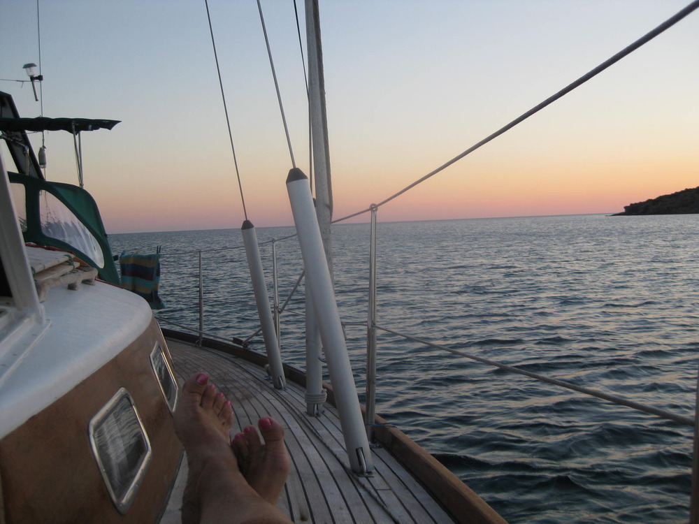 Am Montag segeln wir nach sehr gemütlichem Bordfrühstück mit Leichtwind und mäßiger „Schaukelei“ von 10 bis 5 Uhr zur Insel Ios. Martin und Luci gehen an den nahen Sandstrand. Abends in der Taverne urplötzlich: alles stockfinster, der Hafen dunkel, das Dorf, auch die hochgelegene Chora, die Hügelstadt am Berg oben, alle Straßenlampen sind aus, nur vereinzelt Autoscheinwerfer, die sich wie Strahlen in die nachtschwarze Dunkelheit bohren. Im Hafen schummrige Lichter auf den Segelyachten. Nur das Kind der Schweden am Nachbartisch guckt weiter „Pipi Langstrumpf“ auf Papas Laptop, batteriebetrieben.
