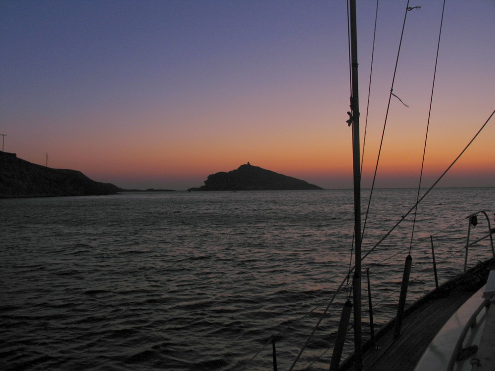 19 Uhr. Wind gleiche Richtung, gleiche Stärke. EOS und die Besatzung werden durch das Kreuzen stark gefordert und beschließen ein anderes, südlicheres Ziel, die Insel Tinos. Jetzt mit Wind leicht von hinten wird die Fahrt weniger feucht, aber schaukeliger, Wir nehmen auch noch das Vorsegel ganz weg. Der Steuerautomat arbeitet gewaltig, gelegentlich kann er aber den Kurs nicht halten und macht durch Piepsen aufmerksam. Die Sonne geht im wolkenlosen Himmel hinter einer schäumenden See unter. Nur langsam verschwindet das Himmelsrot und wird durch ein klares Firmament abgelöst. Ich lege mich schlafen. EOS schaukelt und knarrt, ein bewegendes Konzert. Gerdi steuert und richtet den Blick alle paar Minuten nach vorne. Weit und breit kein Schiff. Gegen 22 Uhr kommt das Leuchtfeuer von Andros- Ostseite in Sicht: Ein Blitz alle 10 Sekunden. Unser GPS leitet uns in Richtung 218° zur Bucht Panormou.