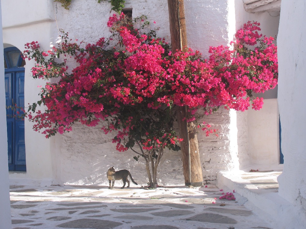Joghurt mit Honig, Orangensaft. Dann laufen wir los. Leider kommt der Bus nicht nach Plan . Die Frau vom Supermarkt ist schon wach. Sie ruft mit dem Handy den Hafenmeister von oben. Der holt uns freundlicherweise mit dem etwas klapprigen Fiat ab, (2×1,40 € – billig wie der Bus) und fährt uns hoch hinauf in die Chora. Weiß, schneeweiß die kleinen Häuschen, die sich zusammenkuscheln am Berghang. Alles noch ganz ruhig, unberührt, ein Zauber liegt über dem Dorf. Wolken geistern über die flachen Dächer, als wir die engen Gässlein und Treppen zum Kastell und Kloster hochsteigen. Kein Mensch unterwegs. Gefegte kleine Plätze, rot-leuchtende Geranien, unser Weg nur weiß bemalte und umrandete Natursteinplatten und –Stufen, jedes Haus ein Kleinod, weiße Häkelgardinen hinter den Scheiben, liebevoll blau lackierte Sprossenfenster, himmelblaue Türen und Balkongeländer, niedrige blaue Latten-Törlein als Eingang. Wie Puppenhäuser, und kein Souvenir-Shop stört das Idyll. Auf engstem Raum schmiegen sich die Studios an den Hang, Feigenkaktus mit üppigen Früchten, gelbleuchtende „Schwarzäugige Susanne“(Busch-Sonnenblumenart), Kaskaden von pinkfarbener Bougainvillea, Weinlaub an den kleinen Terrassen, gackernde riesengroße Hühner in kleinen Felsnischen mit Drahtgitterdach, ein krähender stolzer Hahn.