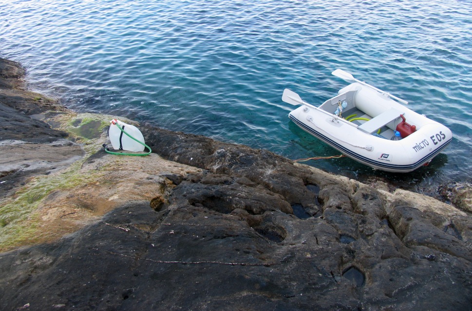 Gerdis Flötenlieder hallen wieder. Das Wasser ist klar und tiefblau über dem Kiesgrund. Wir trinken Kaffee und ich rudere mit MICRO EOS zu einer Quelle am Ufer, um unseren Wasservorrat zu ergänzen. Wie diese kleine fast baumlose, kahle Insel Wasser spendet ist mir rätselhaft.
