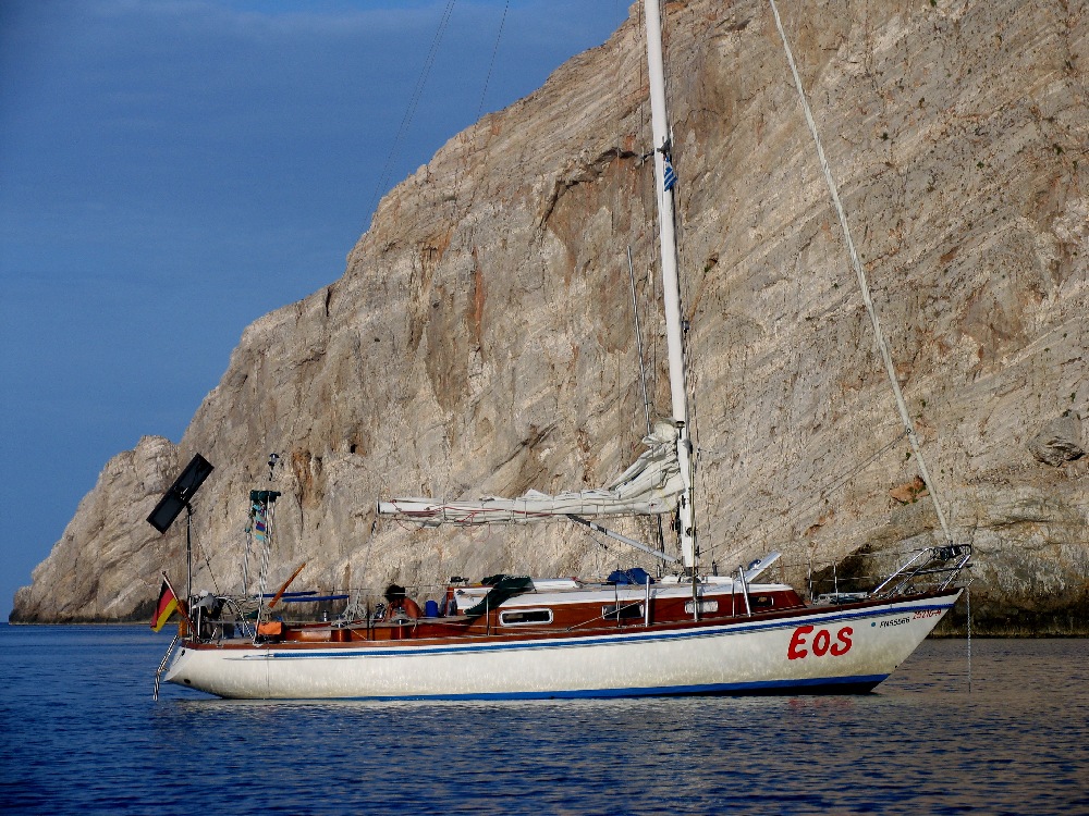 Ein friedlicher Segeltag ohne Reff und hohe Wellen. Sonnen an Deck. Lesen. Um 3 sind wir in der Ankerbucht. Kristallklares Wasser. 10 m Tiefe bis kurz vor die Felsen. Und neben uns senkrecht die schroffe Felswand. Die verheißt Fallböen für die Nacht!