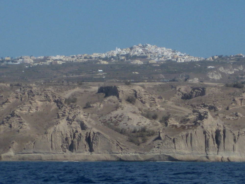 Westwind ist gemeldet, 4-5. Erst wollen wir bleiben, dann aber lockt es uns doch: Gegen Mittag setzen wir Segel, nach 30 Minuten „wie üblich“ 2 Reffs im Groß, 5-6 kn Fahrt, Ziel Folégandros im Westen von Santorin. Meist segeln wir „gegenan“ am Wind. Sportlich. Sonnig. Schön. Die EOS freut sich über ihre Freiheit nach den Hafentagen. Ich drehe ein 8 sec-Video, als wir die Küste von Santorin entlang segeln: Die roten Lavaerde-Schichten, die Sandküste mit den wie Skulpturen anmutenden senkrechten Erosionsmustern, die mich an Vatis Filme von den Buddhas im Bahmian-Tal in Afghanistan 1960 erinnern. Blauwasser-Segeln. Herrlich. Aber der Wind dreht und wir ändern den Kurs und steuern auf Insel Siknos zu. Um 17.30 gehen wir längsseits im kleinen Hafen. Beschaulich. Still. Abendspaziergang den Hügel hoch. Ein Mythos-Bier in der Taverne. Spielende Kinder am Sandstrand, 3 Enten. Kein Tourist. Die Fähre lädt einige Menschen und Autos und einen Tieflader mit vielen Bausteinen aus. Beschaulich. Herbst. Nachsaison. Nur 1 Segler hinter uns: Schweden, die gleich „Ah, eine schöne alte Hallberg-Rassy!“ rufen.