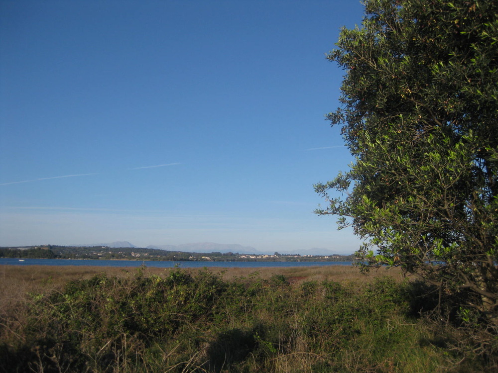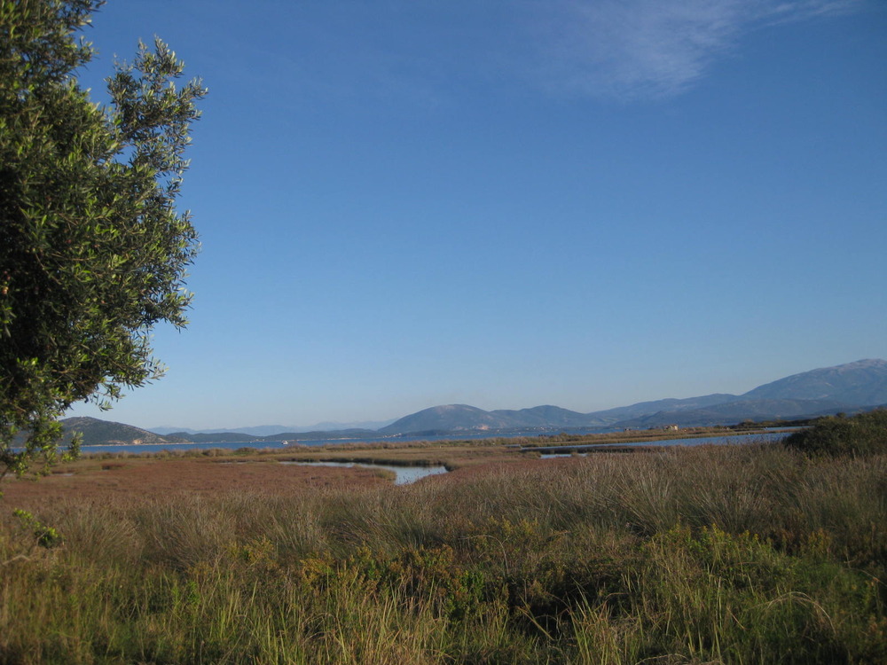 Als die Nachmittagssonne am Allerheiligentag heute, 1.11., warm schien, wanderten wir im feinen Sand direkt am Strand hoch bis zum kleinen Leuchtfeuer…Ein Fischerkahn tuckert zu den Muschel-Stäben in Ufernähe… Unser Blick geht hinüber zum andren Teil des Ambrakischen Golfs, wo die Farben so herbstlich klar und kräftig sind, grün das frische Gras und die üppigen Binsen, dahinter kobaltblau das Meer vom Golf, weiße Reiher erheben sich schwerfällig und ziehen ihre Bahn über ihr ungestörtes Revier…