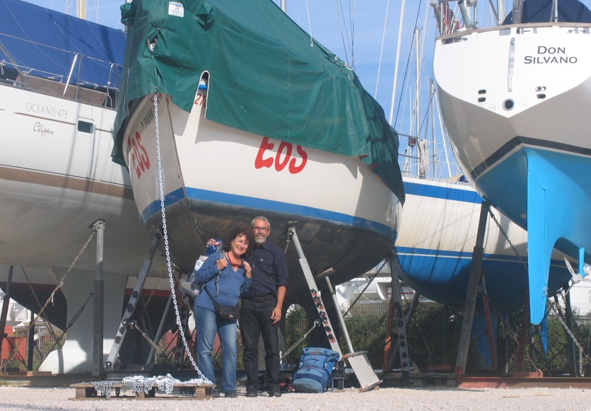 Die Abschlu??arbeiten liegen hinter uns, EOS wird durch eine gro??e Plane gesch??tzt. Die Ankerkette, Ihr seht sie links von Gerdi, liegt auf einer Palette am Boden, damit der Ankerkasten gut austrocknen kann. Das schwarze Unterwasserschiff ist glattgeschliffen und wartet auf den Anstrich mit Antifouling zu Beginn unserer n??chsten Reise im kommenden Fr??hling. Die Leiter ist entfernt und bald f??hrt uns der Marinabus nach Preveza. Von Preveza aus bringt uns der Bus in 5 Stunden nach Athen und entl????t uns dort in die ungewohnte n??chtliche Hektik des Feierabendverkehrs einer Hauptstadt.