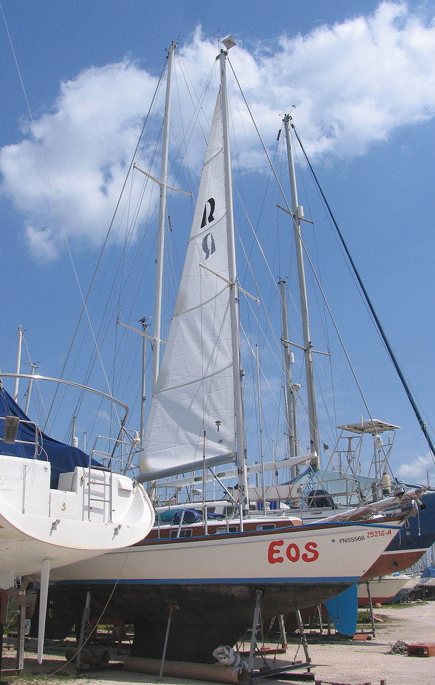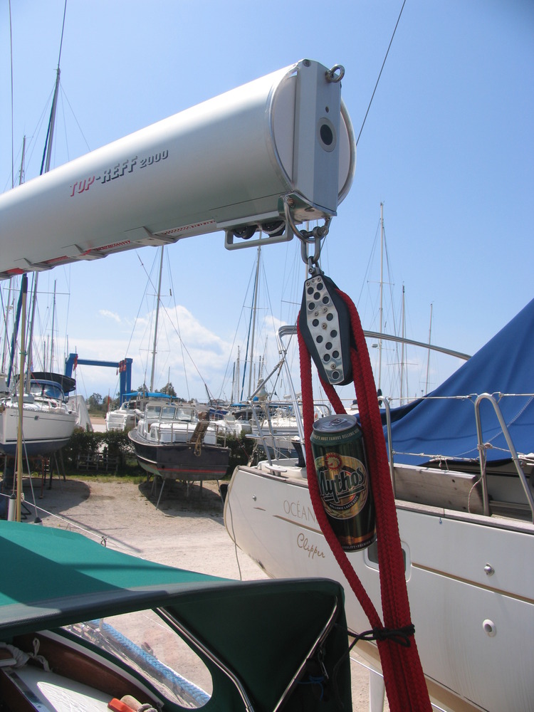 Planmäßig trifft das neue Großsegel der Firma “Toppreff” ein, ( übrigens wie die alte Fock genäht von Segelmacher Pfeiffer in Meersburg!), und die präzise Lochbohrerei gelingt (mit dem Handbohrer!! 40 Löcher!!)…Eine neue rote Großschotleine und Falle werden eingezogen und unter der Sprayhood ins Cockpit verlegt. Künftig muß der Käptn nicht mehr bei Windstärke 8 am Mast oben an Deck rumturnen und das große Segel bändigen und mit Schleifchen die Tuchfalten “einbinden”…Es läßt sich nun vom Cockpit aus reffen.