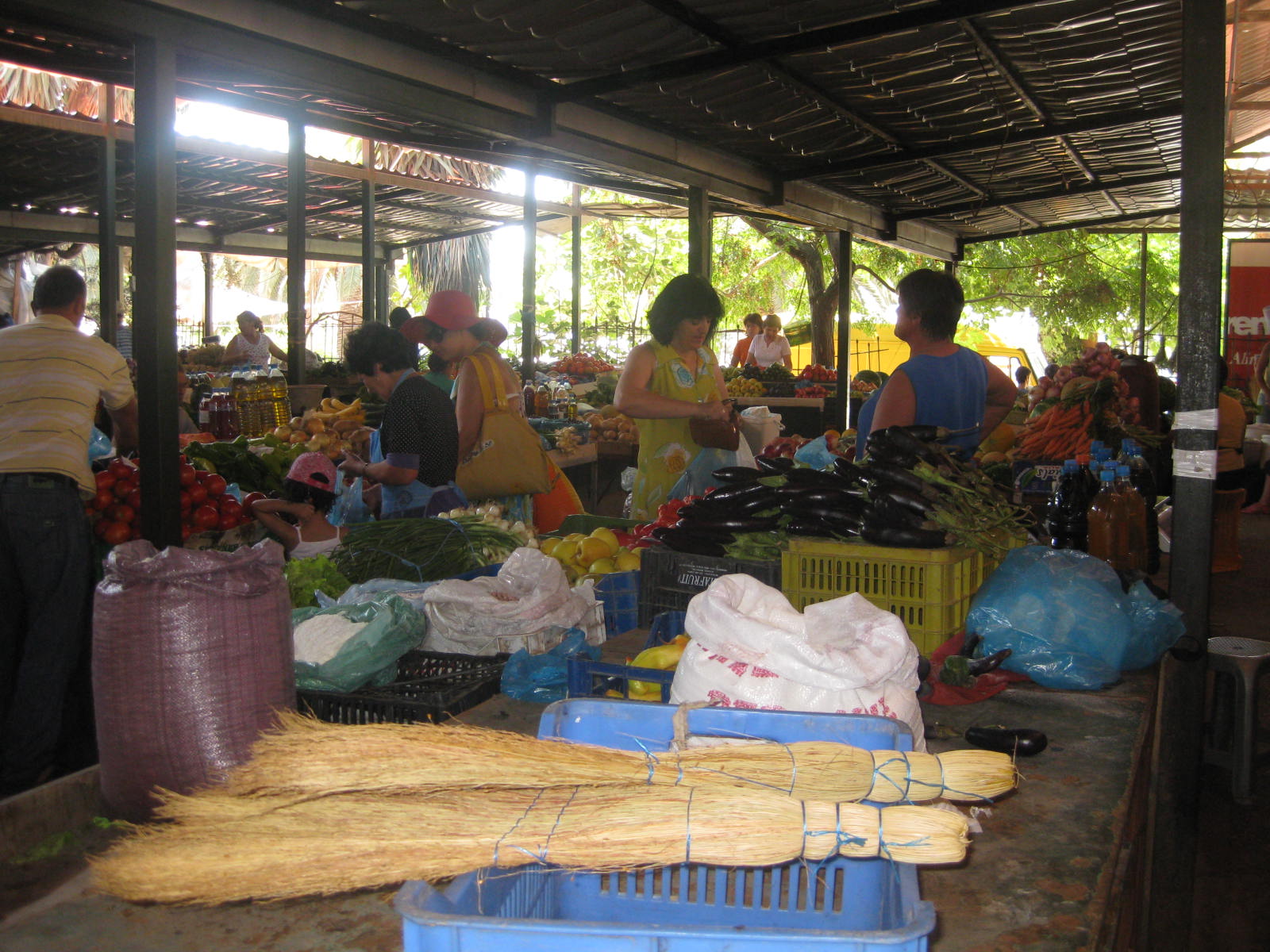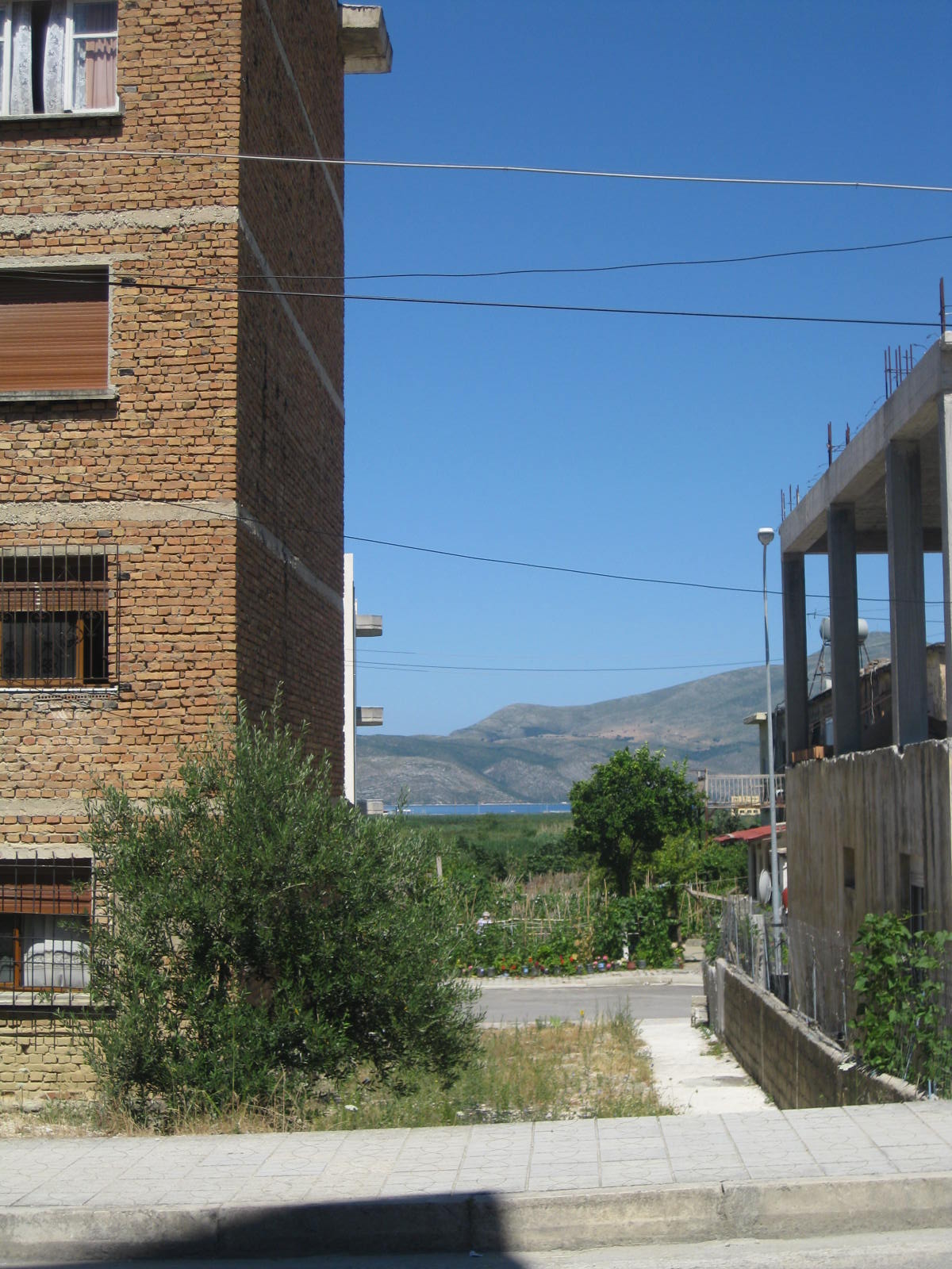 Eine breite, beidseitig von Bäumen gesäumte Hauptstraße, viele kleine Bars, italienisch bestuhlt( fast nur Männer..), Sanitärläden, Frisöre klein wie ein Zimmer, Lampengeschäfte, viele einfache „Markets“ mit schönem, frischem Obst, Salat, Gemüse( Okra, gelbe Bohnen, Tomaten, hellgrüne Paprika, Gurken, Zucchini, kl.Auberginen, Spinat, Salbeitee, Petersilie). Die kleinen Läden sind gut sortiert, liebevoll wird das Obst drapiert, Im Kühlregal hinter Schiebetüren steht sogar deutscher Zott-Fruchtjoghurt neben Eziren, einer alban. Dickmilch, ital. Danone-Activia und Parmalat-Fruchtsaft aus Milano, belgische Butter. Die albanischen Produkte überwiegen. Den verlockenden 4 weißen „Raffaello“-Kokospralinen kann ich nicht widerstehen. Wahrer Luxus! Eine Tafel lila Milka-Schokolade mit ganzen Haselnüssen landet neben alban.Olivenöl und 1 Kilo dunkelroter Kirschen im Rucksack. Mit korrektem Englisch rechnet der junge Kaufmann alles zusammen, wiegt das Obst ab, zählt die Lek genau, er lernte Englisch in der Schule. Stolz ist er, zu recht.