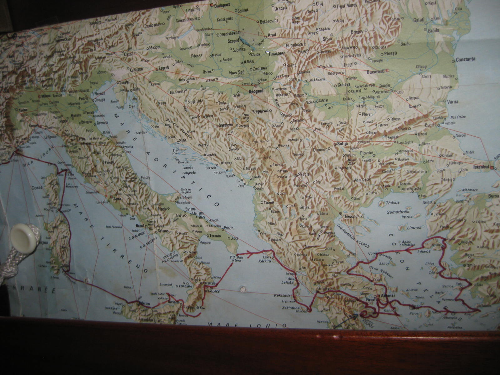 Der Kai steht auf Pfählen und die niedere EOS passt fast unten durch. Ganz am Ende finden wir doch noch ein halbwegs sicheres Plätzchen. Eine Segeljacht aus Königswinter leistet uns noch Gesellschaft. Der Skipper der „Falkenstein“ gibt uns leihweise sein Hafenhandbuch von Albanien in italienischer Sprache. Er segelt wieder zurück nach Korfu. Die stille Bucht erwacht nachts zum Leben: Der Wind pfeift mit kräftigen Böen von den Bergen( bis 2000m hoch, vom Meer aus)! Mit 5 Leinen spannen wir unsere EOS so ab, dass sie nicht zu sehr auf den Kai gepresst wird. Erst gegen Morgen geht den Böen die Puste aus. Gerdi kann nicht von Bord, der Kai ist zu hoch. Ich besichtige ein nahes Fort. Es ist vollkommen erhalten. Düstere Räume mit bogengeformten Dächern und darüber die Zinnen-und Türmchen bewehrte Dachfläche. Was für Leid sich hier vor vielen Jahrhunderten abgespielt hat?