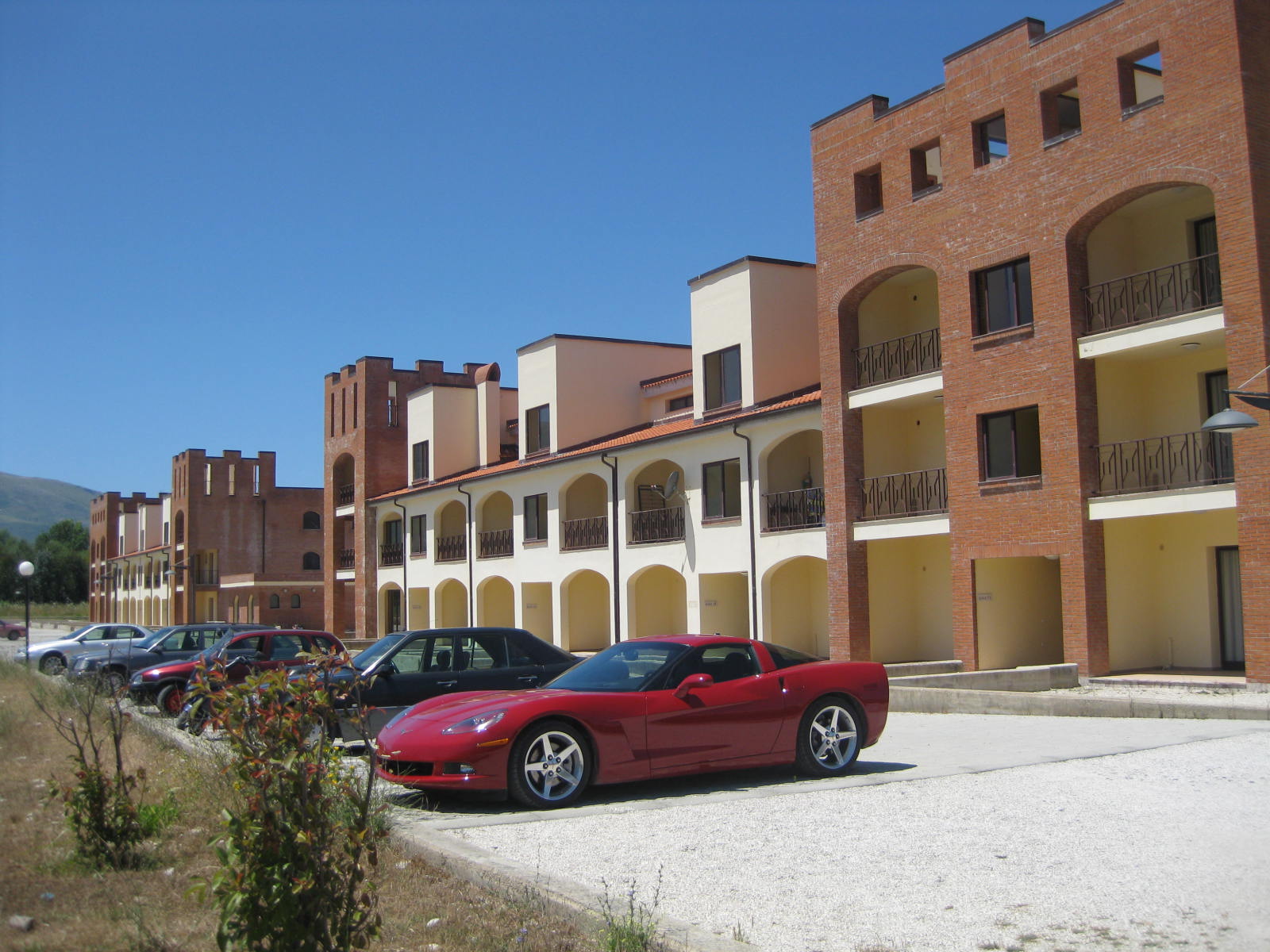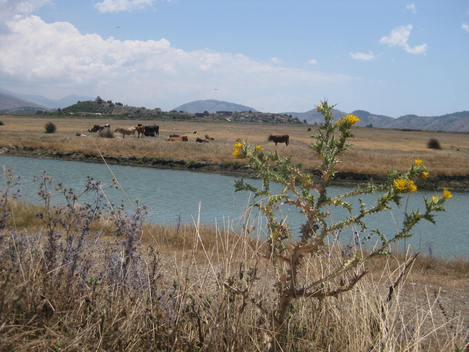 Beim Rückweg überqueren wir den Fluß über eine weiß gekalkte Brücke. Unten hat einer ein Uferdreieck als Garten liebevoll üppig angepflanzt, direkt am Fluß! Unser Blick schweift über große leere Flächen mit gelben Disteln und Wegwarte, zu den braunen Bergen, deren Hänge aussehen wie ein in Falten gelegtes Tuch aus Samt. Davor teils grüne Terassenhänge, Wein? Ein Marmorwerk, Fliesenstapel, auf einem Auto steht „GIPSI“ 🙂 , aber es heißt nicht Zigeunerin! Es ist ein Gipser und Stukkateur. Es fahren hier viele rein deutsch beschriftete Lieferwagen, die noch jahrelang brav ihren Dienst tun.