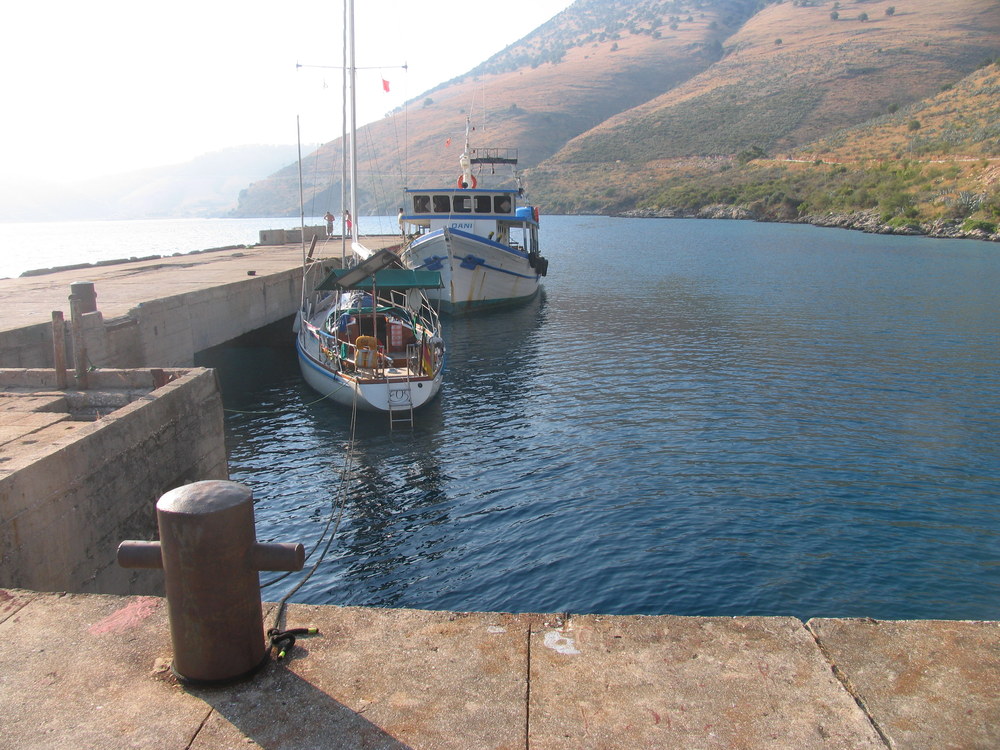Wir verlassen Sarande, die lebhafte Stadt an der schönen Bucht westwärts. Geradeaus kämen wir nach Erikusa, Griechenlands Vorposten und Anlaufstelle der Segler von Italien. Wir aber wenden uns nordwärts entlang der steilen bergigen Küste Albaniens. Da und dort ein Strand mit Sonnenschirmen und Liegen, gelegentlich ein Bergdorf, wohl dort, wo Wasser dem Fels entspringt. Abweisend die Küste für Segler, ohne Hafen. Erst 10 Seemeilen weiter nördlich öffnet sich eine geschützte Bucht, Porto Palermo, bewacht durch einen Leuchtturm, eine Radarantenne und einen Soldatenposten 100 m über der Klippe. Die ehemals verbotene Bucht beherbergt noch einen Militärposten, ein Kriegsschiff erkennen wir und einen Bunker im Wasser, wohl für U- Boote. Da sind wir nicht willkommen. Ein Ankerversuch in einer Nebenbucht scheitert weil der Anker nicht hält. Erst an einem alten verkommenen Kai finden wir Platz.