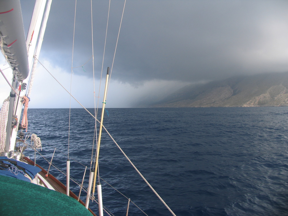 Wetter und Dorf erwachen auch hier nachts zum Leben. Laute Disco- Musik vom Strand, um Mitternacht ein richtiges Feuerwerk. Der Wind frischt heftig auf und steht voll in die Bucht, aus der seltenen Südrichtung. Immer wieder stehe ich auf uns sehe nach. EOS schaukelt stark, ziemlich unbequem zum Schlafen. Um 5 Uhr lege ich ab,Kurs weiter nach Norden. Die Situation wird nicht besser: Größere Wellen aus verschiedenen Richtungen werfen das Schiff hin und her. An Segeln ist nicht zu denken. Tief hängen die dunklen Wolken in den steilen Bergen, ab und zu ein Regenschauer. Wir legen die Schwimmwesten an. Mit Motor gegenan…
