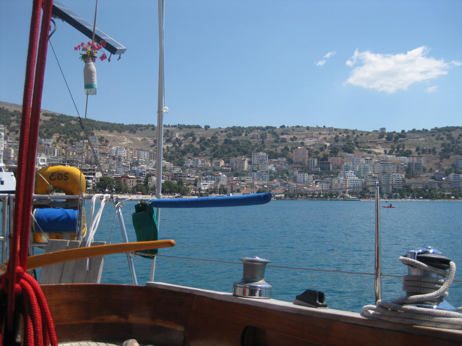 Wir verlassen die Bucht und nach einem windlosen Katzensprung legen wir in Himara an. Ähnlicher Kai, Lastwagenreifen davor, die hässliche Spuren am Rumpf hinterlassen. Mit unserer hölzernen Gangway, allen Fendern und unseren Roller-Reifen halten wir die EOS ab. Die Behörden-Formalitäten ziehen sich hin: Ausweise, eine Crewlist, Bootspapiere abgeben. Ins Dorf fahren, Kopien von allem machen, zurück, nochmal 3 Formulare für Crewlisten ausfüllen, wieder die Bootspapiere abgeben. Dann können wir uns frei bewegen. Ziemlich nettes Touristenstädtchen. Wir ergänzen unsere Vorräte und gehen zum Essen. Sehr freundlich die Kellner.