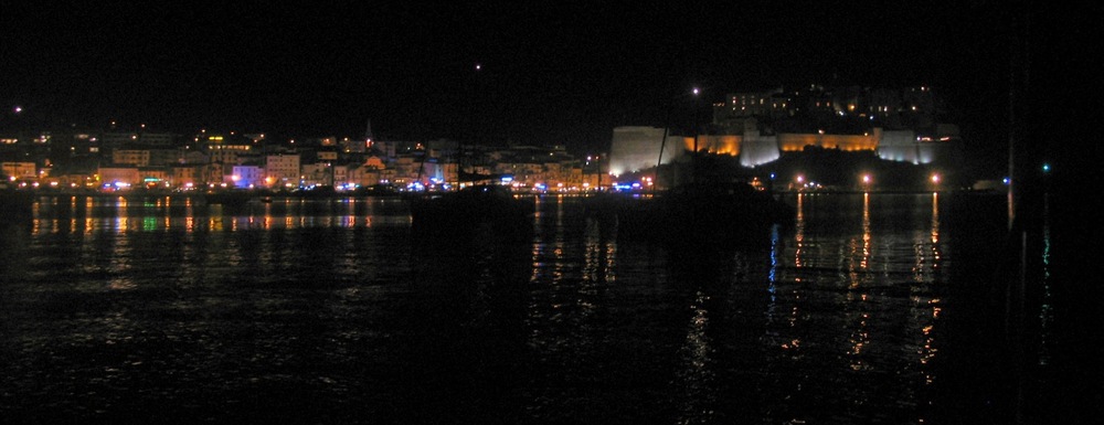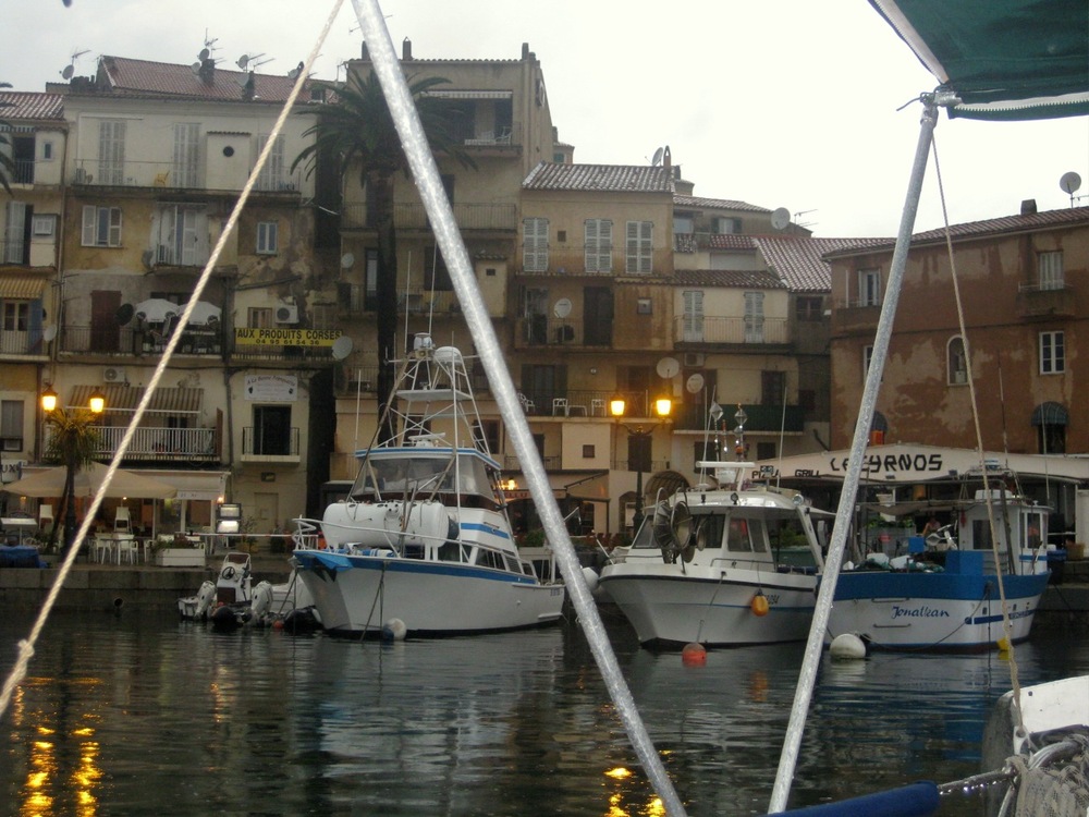 Nach einer ruhigen Nacht vor Anker mit einem traumhaften Blick auf den beleuchteten Burgberg fügen wir uns dem Wetterbericht, der Südwest-Wind der Stärke 8 ankündigt: Wir verlegen die EOS rüber in den Hafen. Man weist uns als kleines 10 m-Schiff in den vor der Burgmauer gelegenen Fischerhafen ein. Als Gerhard zur Capitainerie läuft, nähert sich wie eine Riesenwand die „Mega Express“-Fähre Corsica-Sardegna…nur der 2 m schmale Kai trennt uns von dem Monster!!! Ein Bootsnachbar ruft auf französisch „MADAME!!! Vite, vite!“ – und schon seh ich keinen Himmel mehr! Der Franzose hält mit beiden starken Armen den Bug vorne ab, ich hätte die dicke Mooringleine niemals dichter holen können…Eos wird heftig hoch- und niedergehoben. Am andern Hafenrand sammeln sich Passanten, äugen herüber, bangen mit mir um das Schiff. Die Fotos mögen zeigen, was für ein Riese so eine Fähre ist…