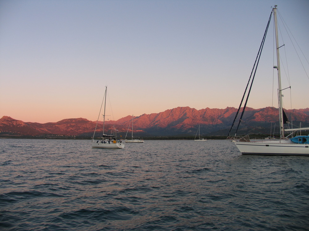 Unser Ankerplatz vor Calvi´s Kulisse war wohl der schönste der ganzen Reise. Hohe, felsige Berge, die Stadt mit ihrer Festung, davor der elegante Strandbogen und unter uns kristallklares, türkisfarbenes Wasser. Dazu die klare Luft nach der abgezogenen Wetterfront. Der GPS- Pfeil zeigt 315° nach Nizza an, bei 4 Knoten Geschwindigkeit meldet es 24 Stunden Fahrtzeit. Mäßiger Wind aus West macht einen Kurs hart am Wind gerade noch möglich. Mal schwächelt der Wind, dann hilft der Motor, dann geht´s wieder ohne Motor.