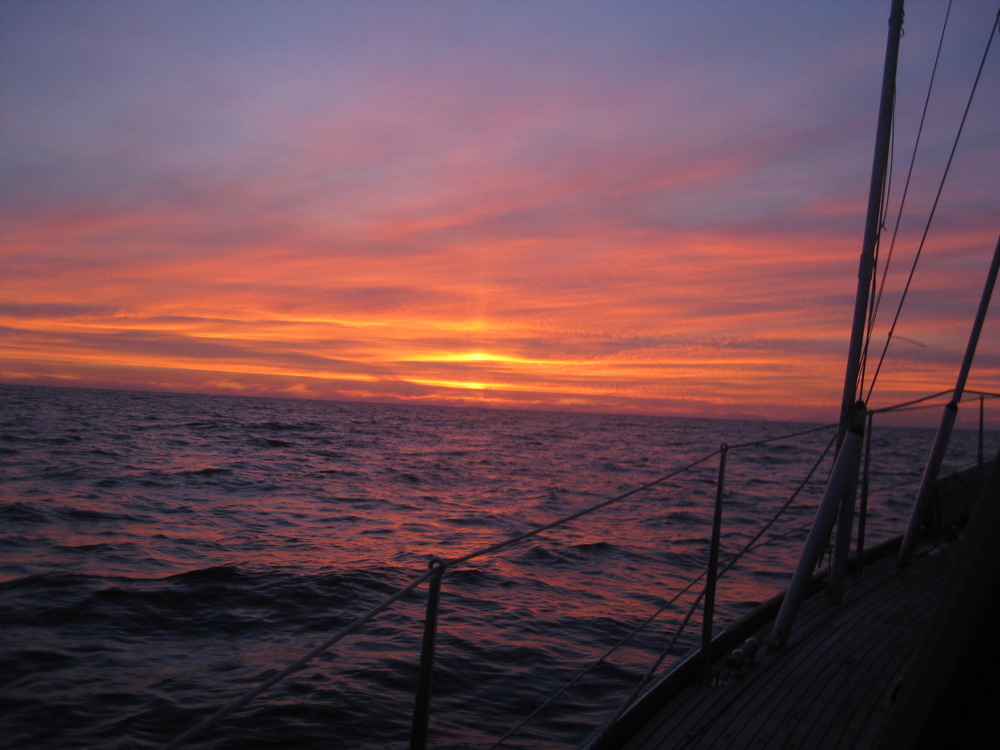 Für unsere letzte Überfahrt zeigt der Sonnenuntergang all seine Pracht. Das Grau geht in ein flammendes Feuerrot über und erfüllt den gesamten westlichen Himmel. Dann wird der prächtige Streifen immer schmäler und der Himmel wandelt sich in ein dunkles Graublau bis der Horizont in Schwärze versinkt. Das GPS weist uns die Richtung und meldet Abweichungen vom Zielkurs. Wir korrigieren dann den Autopiloten.