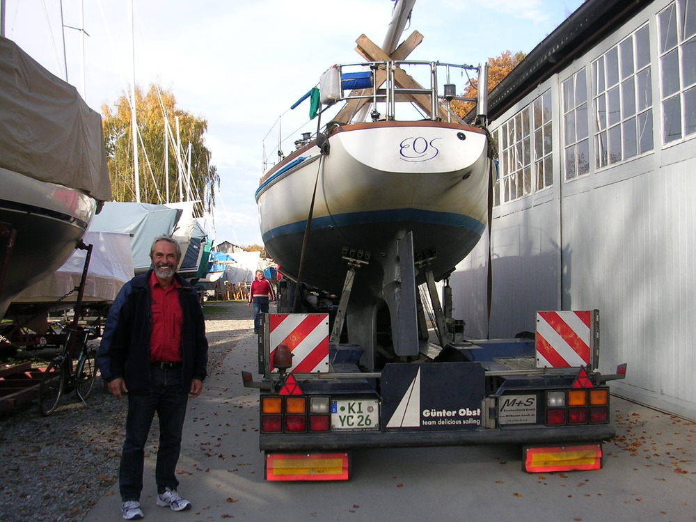 Sie übernachtet auf dem Parkplatz der Birnau und kommt anderntags pünktlich um 10 Uhr zu Landolts Werft in Seemoos bei Friedrichshafen. Salzwasser, 40° Hitze und starke UV-Sonneneinstrahlung setzten den lackierten Holzteilen stark zu und so verbringt unsere fast 40 Jahre alte, rüstige EOS die nächste Zeit in der Werfthalle. Kajütenseiten( Mahagoni) und das Dach( weiß lackierte Oberflächen) werden ausgebessert, die Bordwand soll wieder in weiß strahlen und der Mast ebenfalls. Für kühle Tage baue ich eine neue Heizung ein.