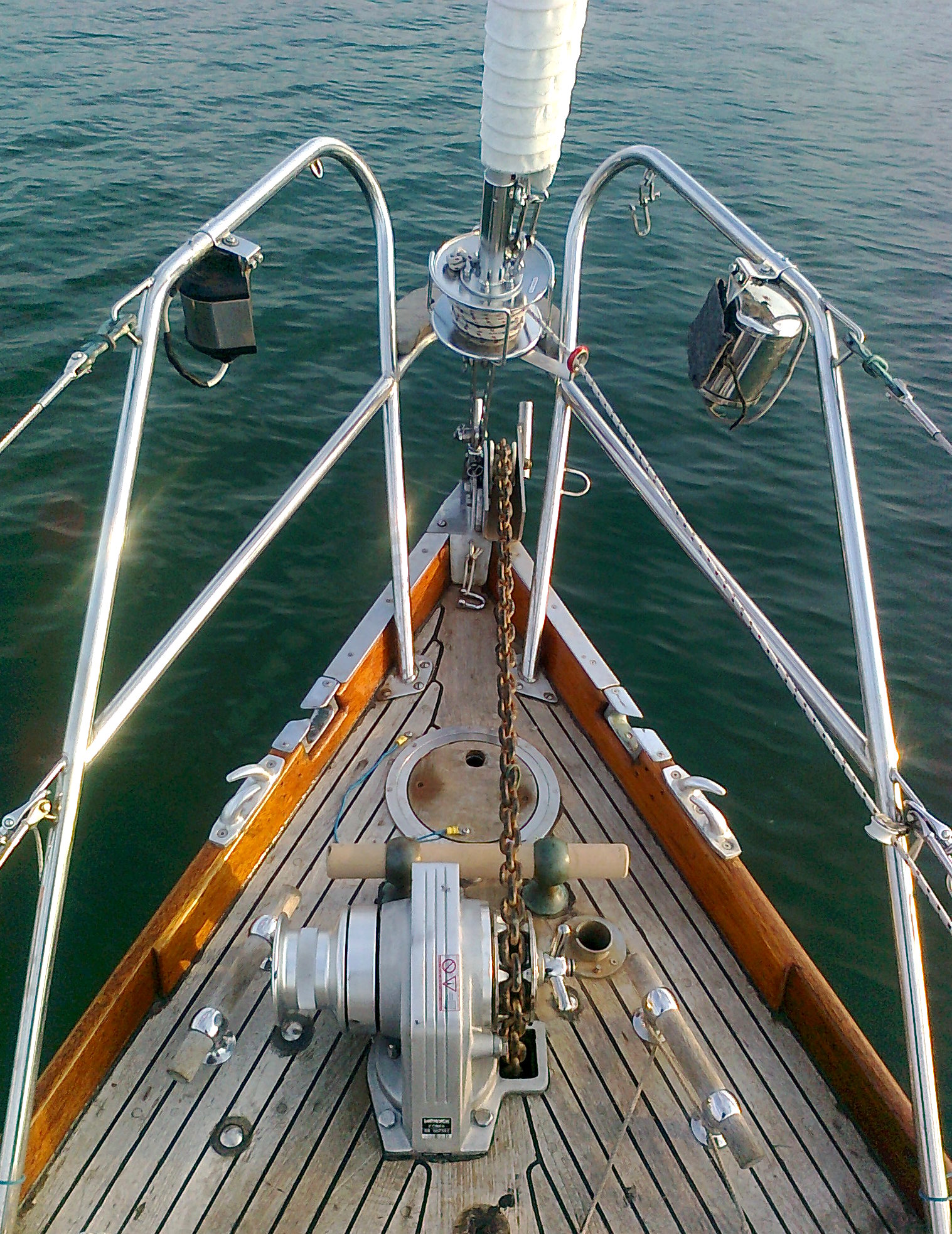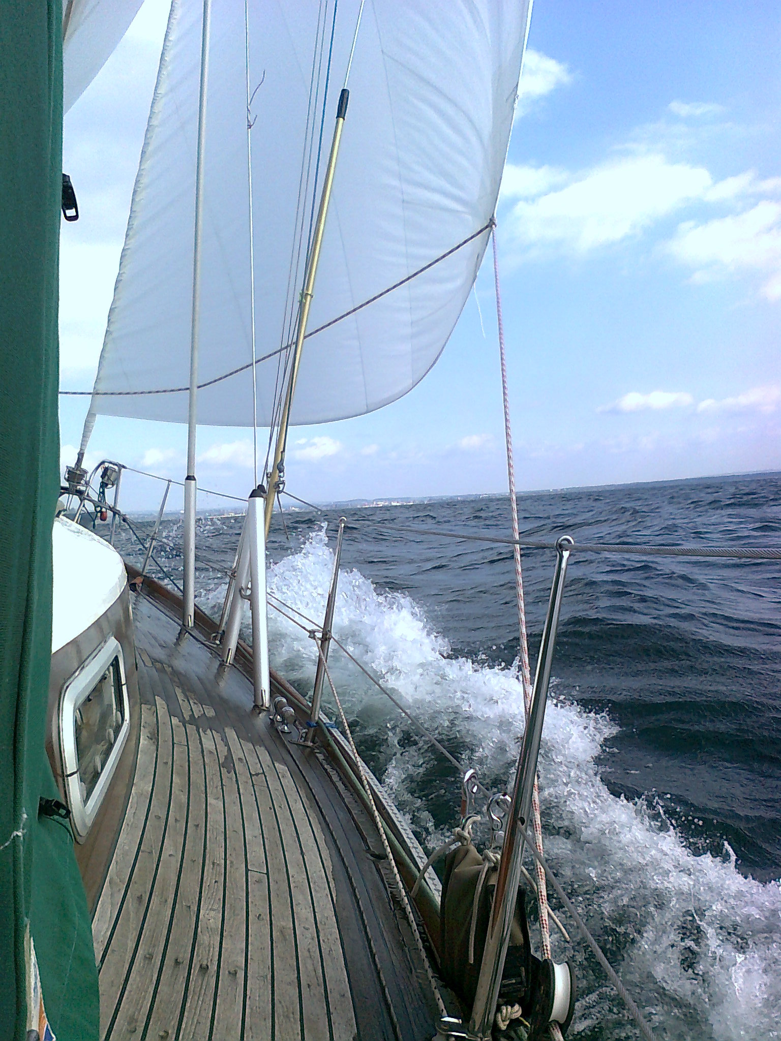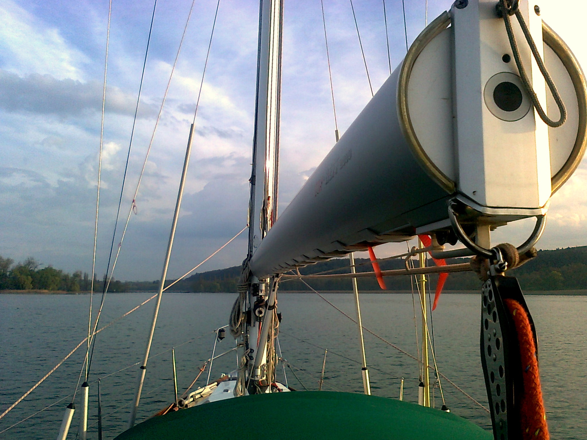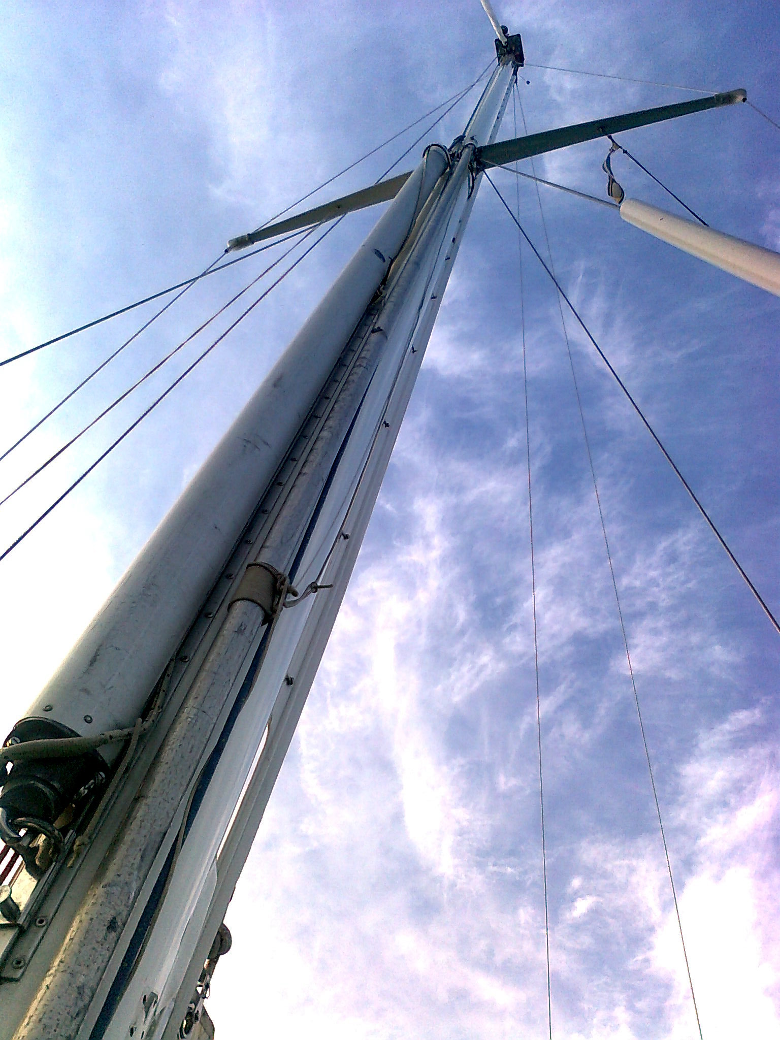Der Spinnakerbaum ist nun vorm Mast, oben der Radar-Reflektor