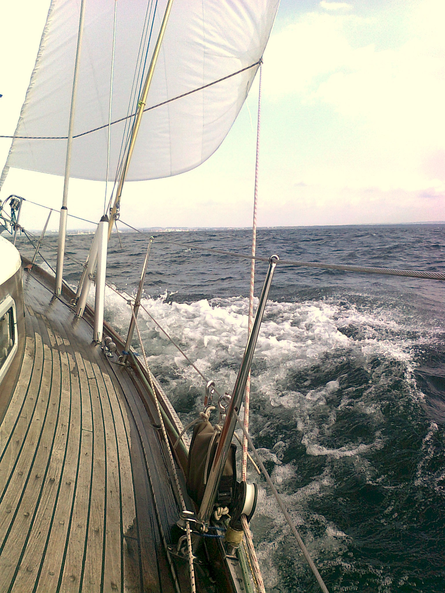 Am Montagmorgen sahen wir schon beim Frühstück im schaukelnden Schiff: alle Ufer blinken orange! Starkwindwarnung. Wir gingen um 10 Uhr unter Segeln Anker auf und mit 2 Reffs preschte unsere fast 40 Jahre alte Lady über den ganzen See. Mit 12 kmh erreichten wir um 11 das andre Ufer. .. flotte Fahrt…Ganz meerig mit weißen Gischtkämmen auf den Wellen.