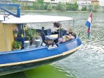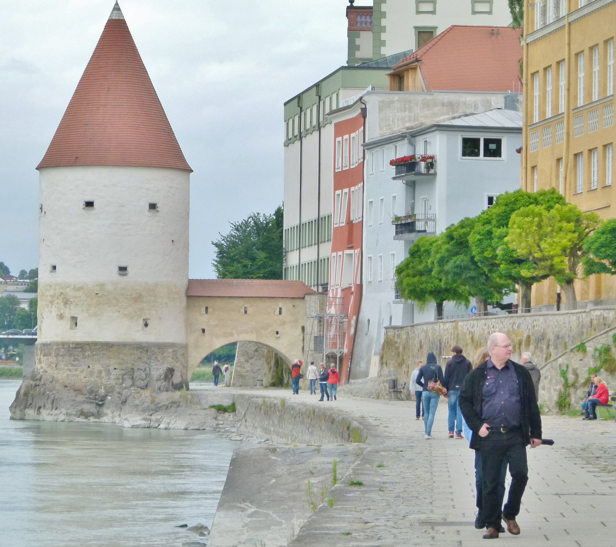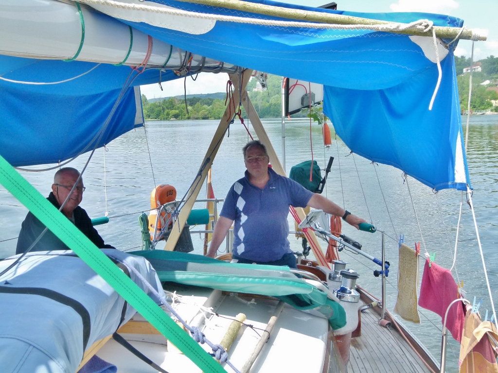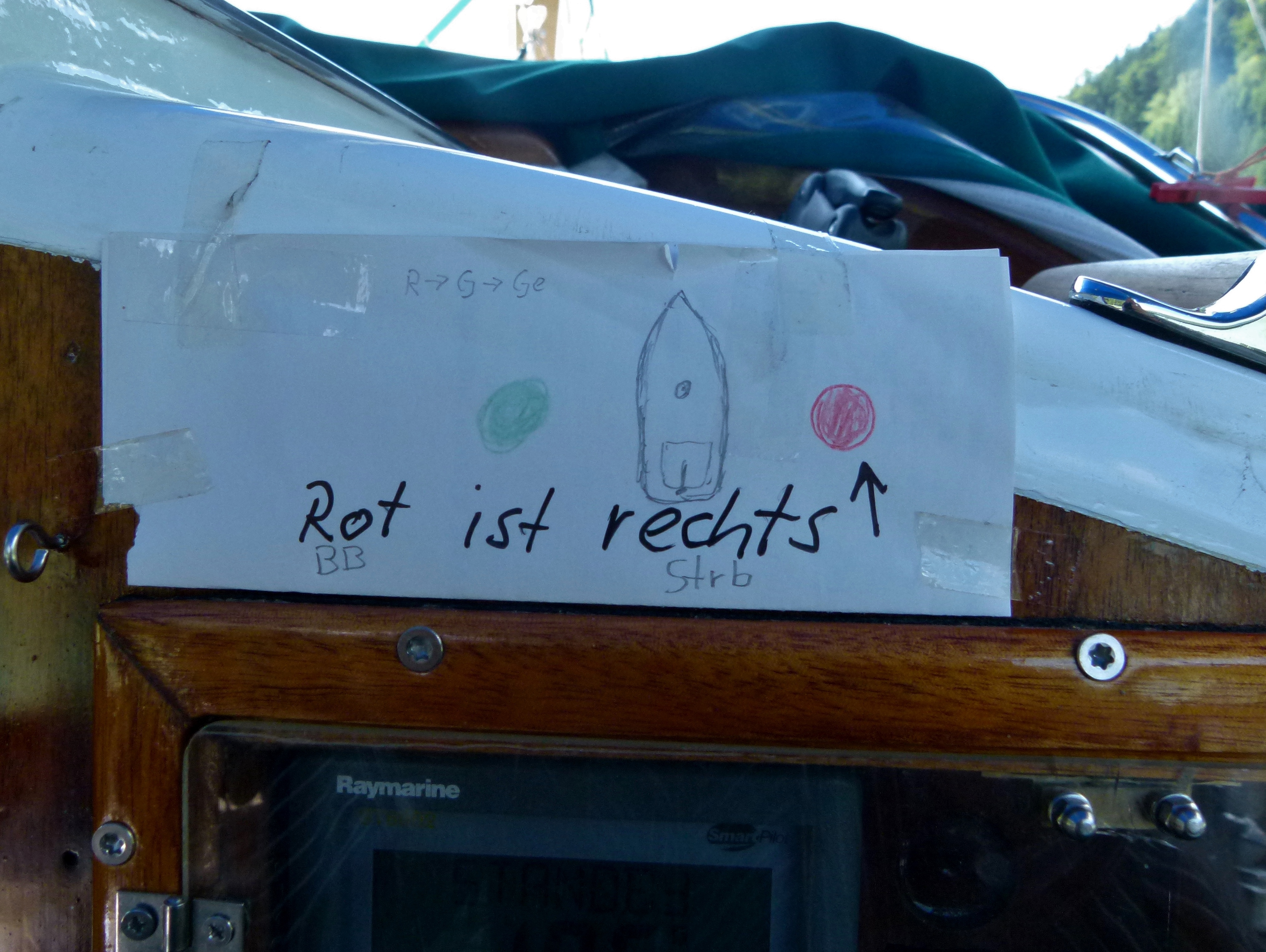 So etwas: Man spricht auf dem Fluss anders als auf See und Meer. Kanal 10, auf ihm wickeln die Steuerleute ihre Gespräche ab, wenn sie sich begegnen. Hallo Bodenseesegler! Da gibts kein Steuer- und Backbord, sondern rechts und links, oder rote und grüne Seite, je nach dem, welche Bojenseite gemeint ist. Gewöhnlich fahren die Schiffe rechts, wie die Autos auf der Strasse. Wenn aber ein langer Schubverband talwärts fährt und er begegnet einem Bergfahrer, dann wechseln sie gelegentlich die Seiten, weil der lange Bergfahrer mit dem Heck stark „ausschlägt“. Der Talfahrer (der hat Vorfahrt) sagt dann zB: „Amalie, Kilometer 1778, Rechte Seite“. Der Bergfahrer bestätigt ebenso: „Mozart, Rechte Seite, Danke“ Sie fahren also so vorbei, wie man sich in England auf der Strasse begegnet. Begegnen sich die Schiffe normal, dann heißt es „Linke Seite“. Wir haben an der EOS einen Zettel, da sind die Seiten mit roter und grüner Tonne vermerkt und dass rot rechts ist, Unglaublich, wie schnell man sich in der Eile verheddert und das kann dann kritisch werden, fährt man eine der vielen Tonnen von der falschen Seite an. Die Schiffer reden immer von „Abladetiefe“, das ist deren Tiefgang. Zwischen Straubing und Deggendorf konnten sie nur mit 1,5m Abladetiefe wegen des niederen Wasserstandes fahren. EOS mit 1,5m Tiefgang war da auch hart an der Grenze. EOS ist zwar ein kleiner Zwerg, muss sich aber gelegentlich auch in den Funkverkehr einschalten. Immer vor einer Schleuse. Da meldet man sich per Funk an und erfährt, ob man im Oberwasser (die höhere Seite des Fahrwassers) bis zum Aufrufen anlegt oder gleich oder nach einem Berufsschiff einfahren kann.