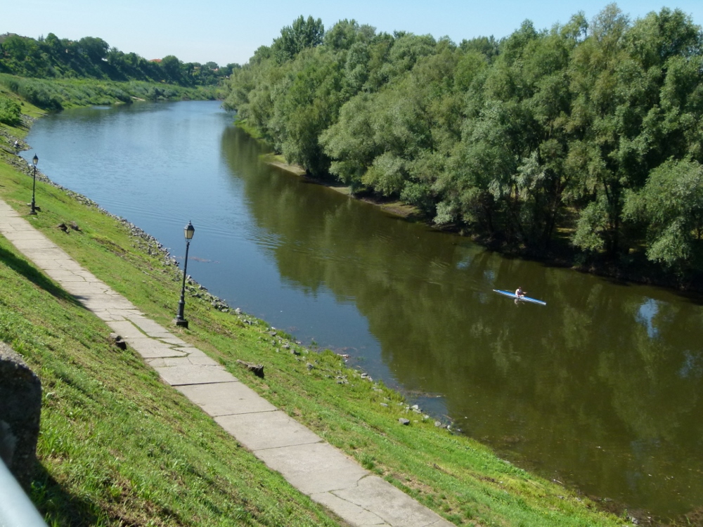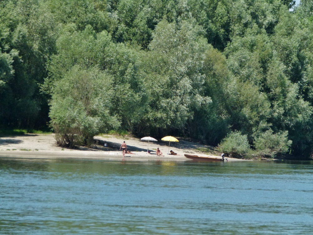 In Baja versorgen wir uns und kehren mit schwerem Rucksack heim. „Massenhaft Donaufahrer“: Eine große Motorjacht aus Deutschland, ein englischer Segler und das junge Paar mit dem winzigen Segelboot. Die passen mit gesetztem Mast unter den Brücken durch. Wir biegen wieder nach der Kanalfahrt (Baja liegt etwas abseits der Donau) in den Strom ein. Die Häuser bleiben achteraus und uns umfängt wieder die Natur. Im Laufe der Zeit wurde der Strom seiner Nebenarme beraubt und in sein jetziges Bett gezwängt. Steinschüttungen an der Prallseite, gegenüber Sandbänke oder Buhnen. Hier badet eine Gruppe, dort liegt ein Kahn versteckt oder ein Angler versucht sein Glück. Gelegentlich eine Verladestelle für Kies, Getreide, Öl. So windet sich die Donau und unterstützt uns beim Vorwärtskommen. Würden nicht viele diese lange Reise als langweilig empfinden? Ganz falsch ist das nicht. Wir sind ja auch eine lange Weile unterwegs und da fällt alle Hast ab, wenn der Motor gleichmäßig tuckert, das Wasser wellenlos arbeitet und sich das Umfeld ganz langsam verschiebt. Ab und zu ein Blick auf die Flusskarte oder mit dem Fernglas die nächste Boje finden. Abwechslung bringt gelegentlich einer der riesigen Schubverbände oder ein Kreuzfahrtschiff. Das Starren auf das Echolot hat aufgehört, die Wassertiefe bewegt sich zwischen 3 und 10 Metern (hoffentlich bleibt das so).