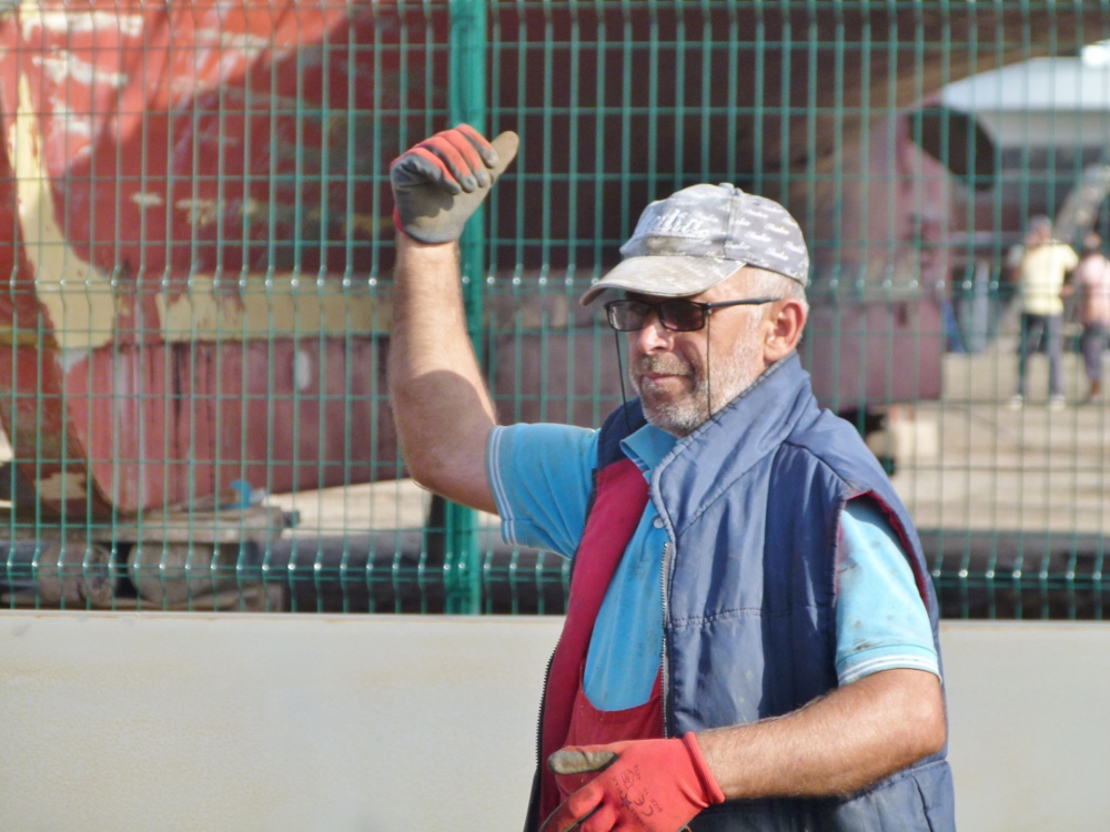 Der Taucher und Vorderlader-Fahrer: Wenn der Slipwagen ins Wasser fährt, fährt er im Taucheranzug mit und dirigiert das Schiff zwischen die Stützen. Keine ungefährliche Unterwasserarbeit. Gulets wiegen oft über 100 Tonnen. Seine Hand ragt aus dem Wasser und signalisiert dem Adilettenmann oder dem Steuermann an der Schiffsmaschine, was zu tun ist. Ist das Schiff aus dem Wasser, dann steigt er (mit Taucherbrille und -anzug) auf sein riesiges Fahrzeug und drückt den Slipwagen in die Parkposition. Sein Nachtlager hat er auf einem Sofa im Aufenthaltsraum aufgeschlagen.