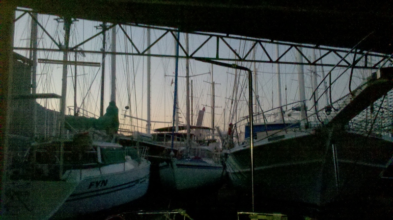 Da lebe ich jetzt mittendrin. Es ist keine Ölsardinenfabrik, wie in John Steinbecks fröhlichem Roman, sondern die Werft bei Bozburun. Es wird fleißig gearbeitet, traditionell. Hölzerne Gulets zu reparieren, dazu bedarf es keiner filigranen Werkzeuge. Es genügen Kettensäge, Schreinerhammer, Hobelmaschine, Bandsäge und noch ein paar Werkzeuge und Maschinen mehr. Ja, es wird gearbeitet, an Schiffen. Aufräumen wird nicht als Arbeit angesehen, vielleicht wird es nicht bezahlt? Rund um EOS und 3 weitere Objekte stauben Surfbretter, eine alte Bandsäge, irgendwelche Bootsteile und vieles mehr ein. Mustafa benutzt zum Einschalten der Hallen-Beleuchtung im Verteilerkasten eine Stange. Keine Möglichkeit, den Kasten anders zu erreichen. Staubsauger sind viele da, irgendwo auf einem Haufen alter Dinge. Nachteil: Sie sind kaputt. Aber das Wunderbare: Mitten in einem Berg aus Abfallholz und Spänen entstehen wunderbar geschwungene Schiffe, teilweise über 20m lang. Die Kielbögen, vielfach laminiert mit edlem S- Bogen am Bug und aufgebogenem Steven. Es riecht aromatisch nach Holz und es klingt überall nach Hämmern, Hobeln und Sägen. Werkstattmusik.