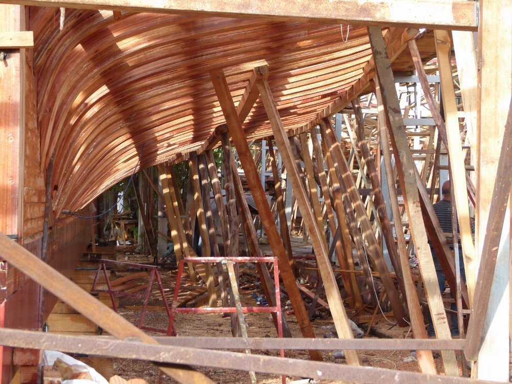 Ein paar Tage später ist plötzlich ein Spant ersetzt, dann eine Planke nach der anderen PASSGENAU eingesetzt und mit wuchtigen Hammerschlägen festgenagelt. Mit dem Elektrohobel abrunden, kalfatern, verspachteln. Erstaunlich schnell wird die kranke Stelle wieder verschlossen. Eine traditionelle, wunderbare, kleine Welt der Arbeit. Als Kunde wär’s mir mit weniger Unordnung viel lieber. Unverständlich für die anderen.
