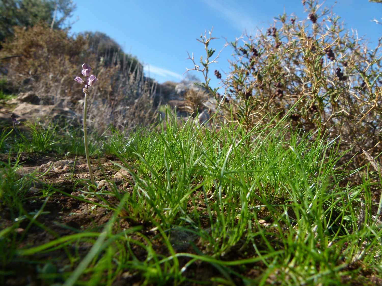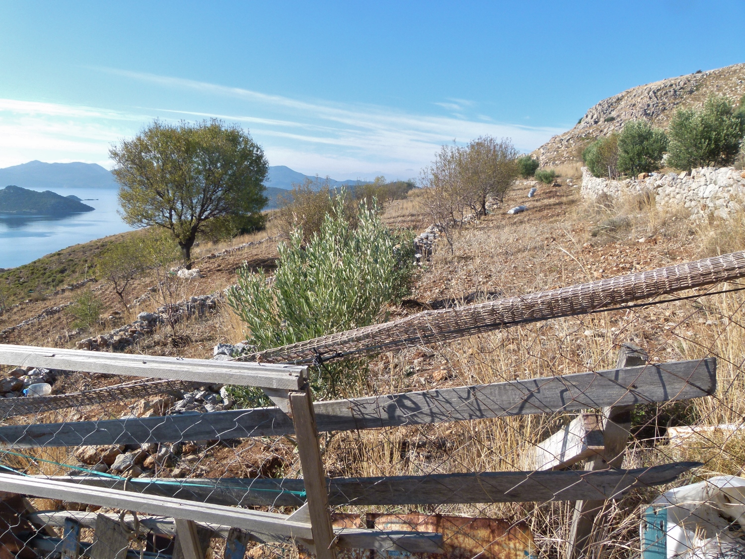 Der Mittelmeerherbst kommt. Aus den braunen Stachelbüschen wachsen winzige grüne Blättchen, kleine weiße und blaue Blümchen sprießen aus der Erde. Die weißen Blüten auf den langen Stängeln aus den großen Zwiebeln aber, die noch vor 2 Wochen so schön blühten, haben sich in grüne Samenkapseln verwandelt. Zwei Mandelhaine auf gepflegten Terrassen liegen auf halber Berghöhe.