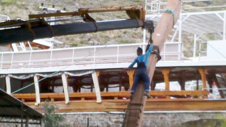 Ein Mitarbeiter löst das Kran-SeilTradition: nach dem Aufstellen des Kiels wird eine Ziege geschächtet