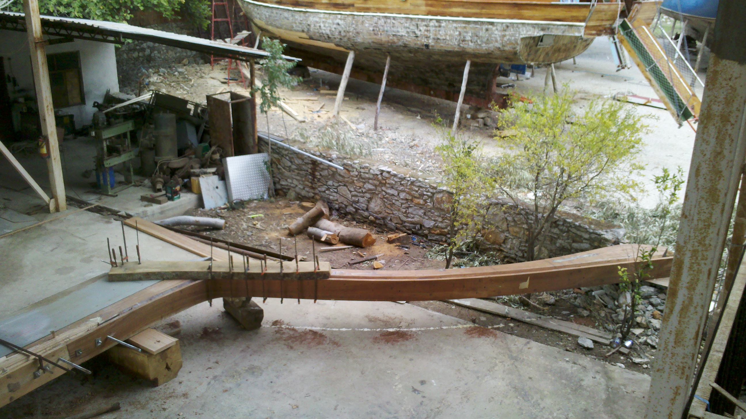 Hier, halb unter freiem Himmel, entsteht eine 40 m lange Gulet aus Mahagoniholz. Ganz am Anfang bauen die Handwerker den Kiel. Als mächtiges Rückgrat der künftigen Gulet liegt er noch flach. Die geschwungene Bugform wird durch vielfaches Verleimen dünner Mahagonibretter in diese elegante Form gezwungen. Das Heck entsteht durch Verleimen dicker, schwerer Bretter.