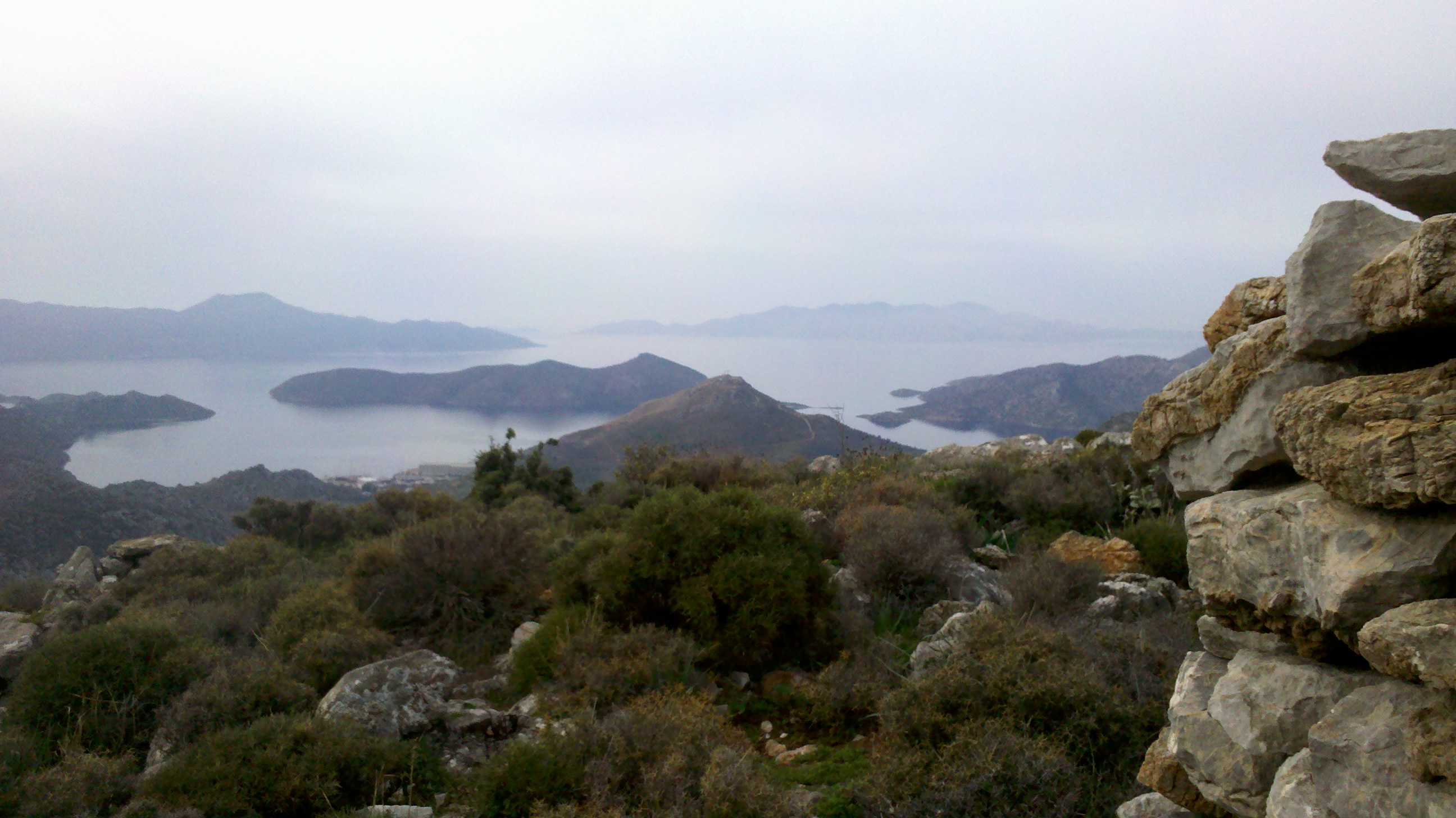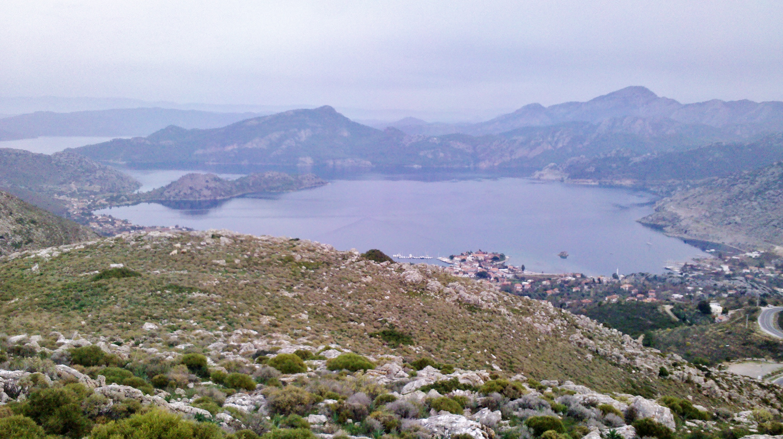 Über der Straße nach Marmaris fängt der Berg erst richtig an. Wie üblich pfadlos durch stacheliges, niederes Gewächs. Immer weiter wird der Blick. Dann will ein Felsriegel den weiteren Aufstieg versperren. Kann er aber nicht. Es gibt einen Durchstieg und dann bin ich schon fast oben. 322 m zeigt das GPS. Nicht gerade eine grandiose Höhe, aber der einzige Berg im Nahbereich. Jetzt blicke ich auf der anderen Seite in die Bucht von Selemye.