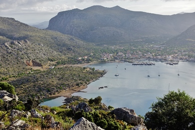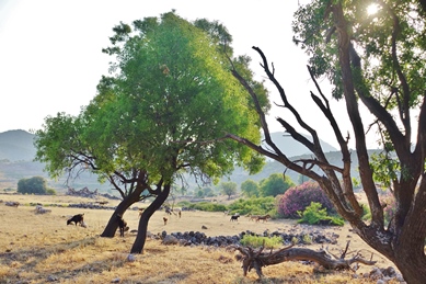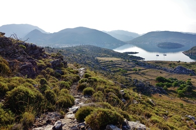 Bei unsrer Wanderung fand ich an einer Mauer meterhohen saftigen Dill, der uns den Gurkensalat delikat würzte. Die kleine Straße führte uns zuerst ca. 3 km am Meer entlang, eine gepflegte Promenade, links die Appartementhäuser und Tavernen unter schattigem Weinlaub, umblüht von Oleander, Bougainvillea, violettblauen großen Winden-Trichter-Blüten. Vor einem Haus war meterweit Salbei zum Trocknen ausgebreitet, mit lila Blütchen duftete der Thymian am Straßenrand.