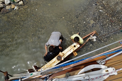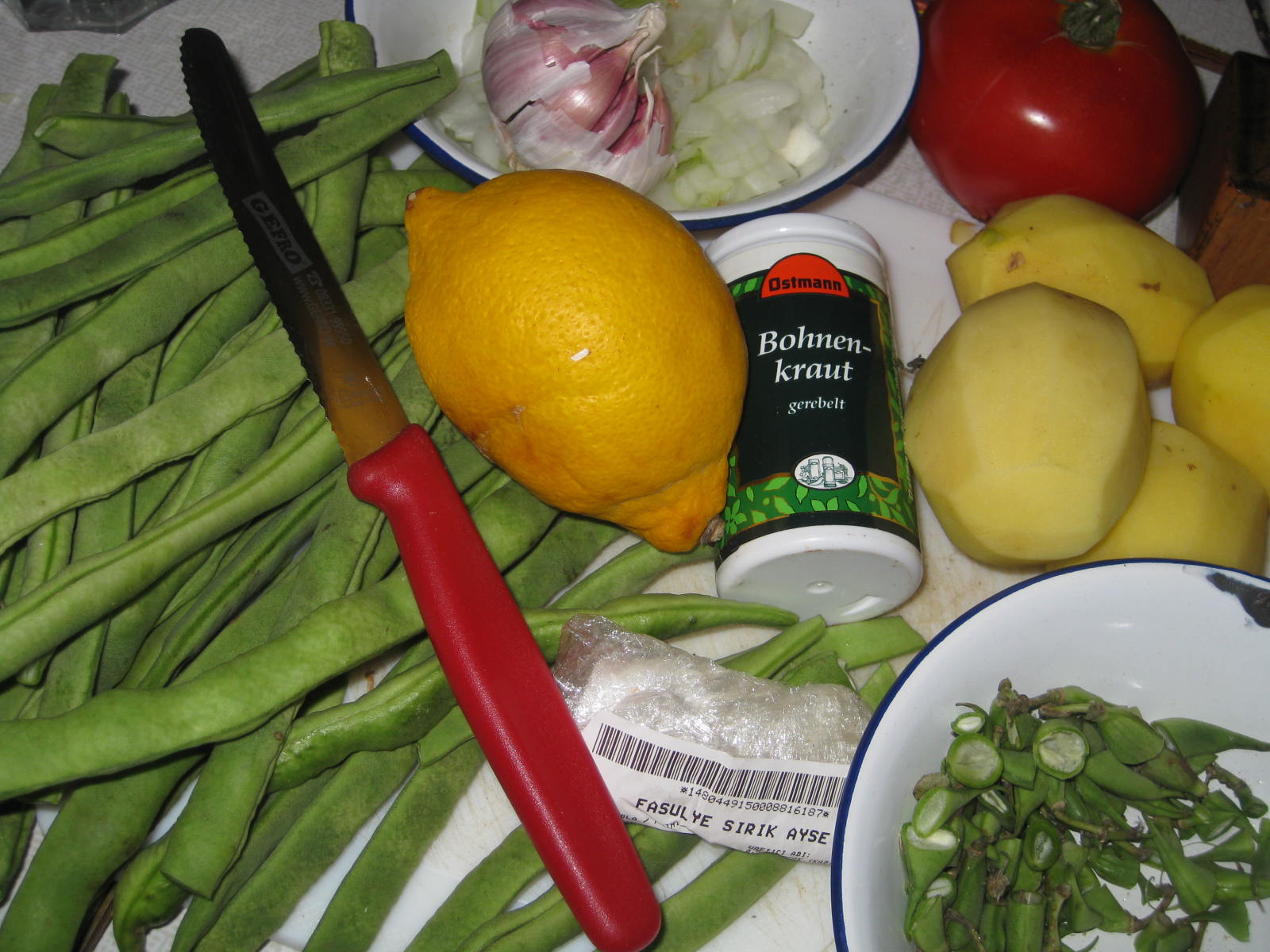 Ankertage, Zeit zum gut Kochen an Bord. Im Schlauchboot bringen wir unsere Rucksäcke an Bord mit frischem Gemüse, köstlich. Mal bereitete ich ganz frische Bohnen zu ( Fasulj heißen sie- wie im Griechischen), mit deutschem Bohnenkraut, türkischem Olivenöl, Zitrone-5 Minuten im Fissler-Drucktopf.