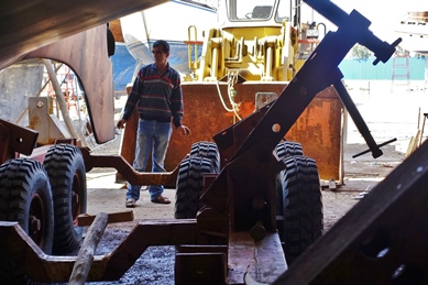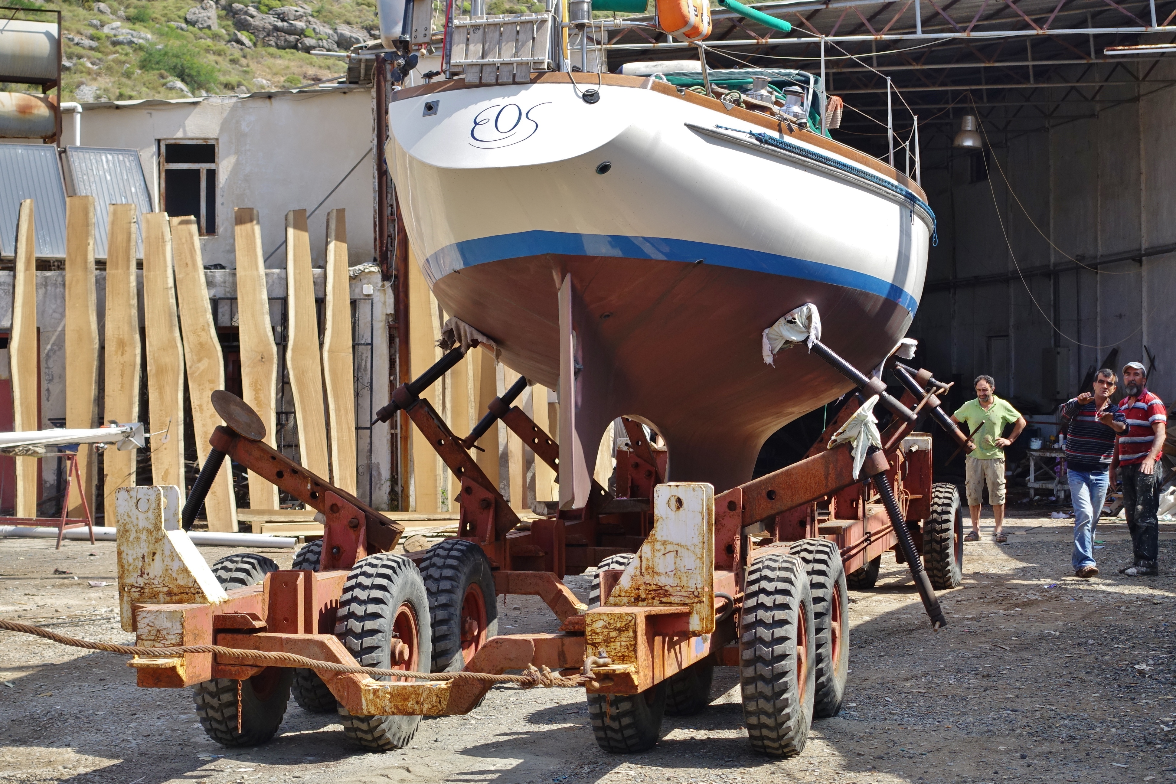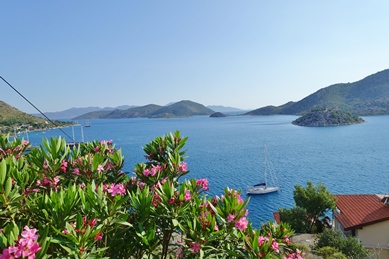 Rechts bot sich ein umwerfendes Panorama aufs weite Meer zu den buchtenreichen Küsten dieser Peninsula, dieser traumhaften Halbinsel am südwestlichen Ende der Türkei. Wie auf einem Gemälde – ebenso schön wie der Blick von den Hügeln auf Bodrum! Gulets vor Anker, weiße Segel der Yachten auf der Suche nach einem der vielen Ankerplätze vor Bozburun…! Am Dorfende die Krankenstation, der Friedhof, ein Möbelgeschäft, die Moschee und die Tankstelle. Auf den Brachflächen zwischen den kleinen Häusern sind große freilaufende Hühner braune, schwarze-weiß gesprenkelte wie Perlhühner, stolze fast gans-große Gockelhähne, viele Junghühner, angepflockte Geißen mit ihren Zicklein, Schafe, deren frisch geschorene Wolle Frauen am Boden hockend zupfen zum Spinnen. Haushoch immer wieder die riesigen Gerippe halbfertiger Gulets, daneben der Kiel im Gebüsch. Zwischen modernen Appartmenthäusern plaudern Frauen mit weißen Kopftüchern fröhlich zusammen im bergenden Schatten ihrer Mandelbäume, Mistelbäume und Stein-Eichen.