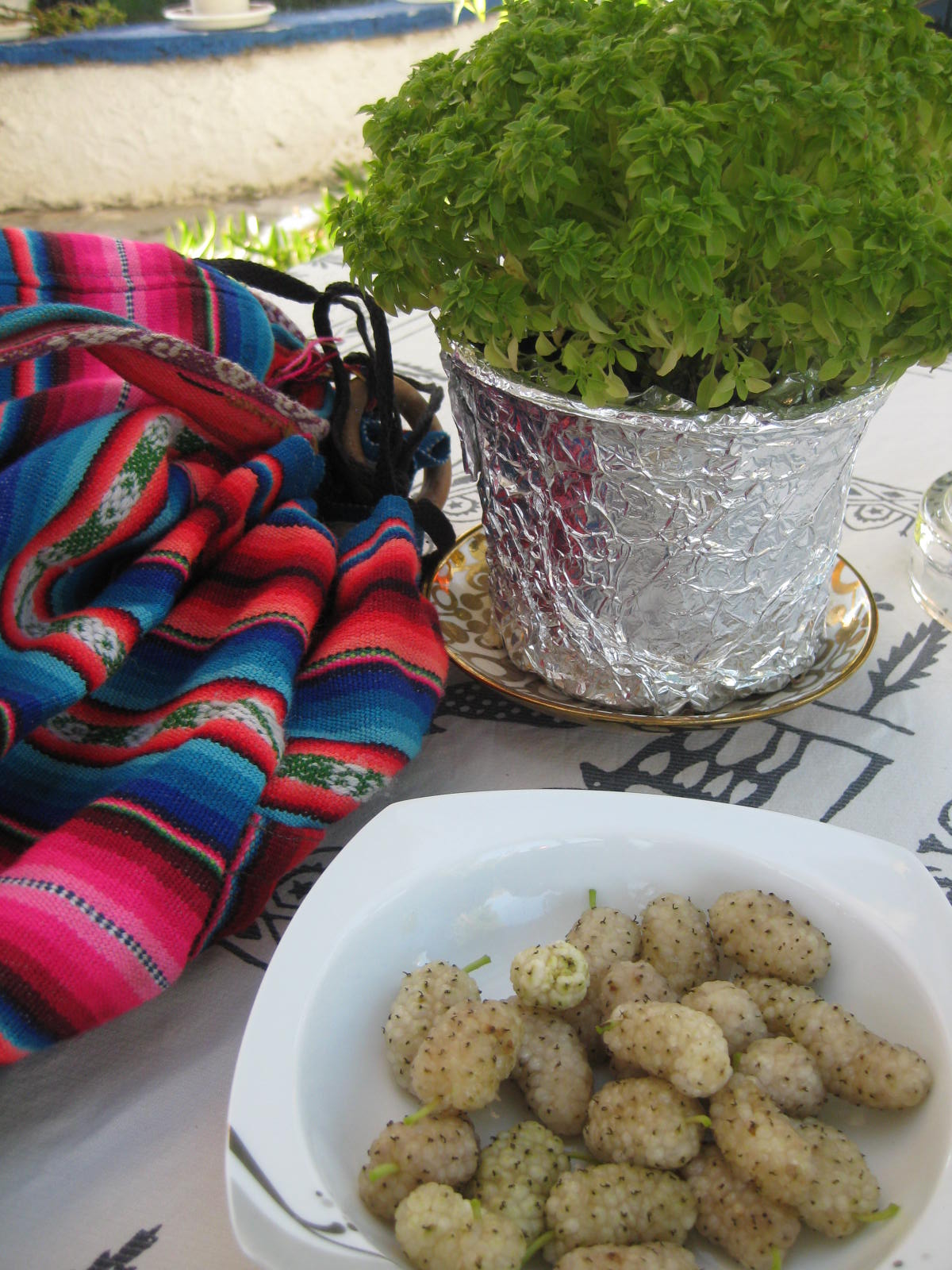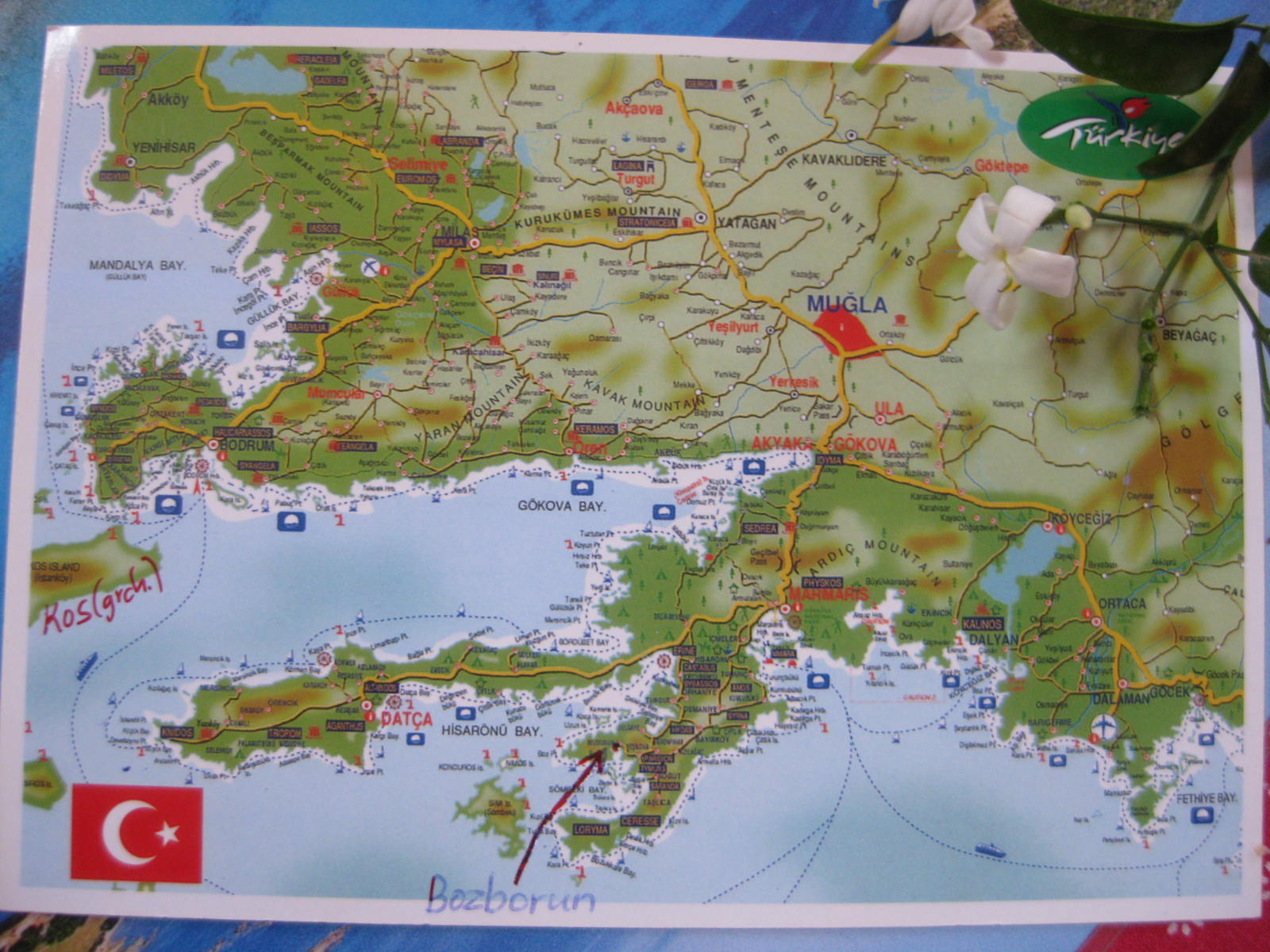 Gestern besuchten wir wieder das vom Weinlaub so schön schattige Gartenlokal am Hafen-Ende, um den köstlichen frisch gepressten Apfelsinensaft zu trinken, den uns die nette Wirtin macht- sie erkennt uns wie vor Jahren und fängt immer gleich an, Saft zu pressen. Dazu eine nette Geschichte: am Notebook erscheint als WLan-Verbindung immer das Wort Nilufer. Da wir gerne die CD mit den Commedian Harmonists hören, auf dem der Song vom Pharao am schönen blauen Nil ist, las ich „Nil-Ufer“. Eines Tages guckte ich im Türkisch-Wörterbuch nach, ob es dieses Wort gibt: Ja, es heißt Seerose. Als ich in den Springbrunnen dieses Lokals „Nilüfer“ schaute, entdeckte ich lauter bunte Seerosen darin- aus Plastik:-). Die Wirtin heißt „Nilüfer“, also Seerose.