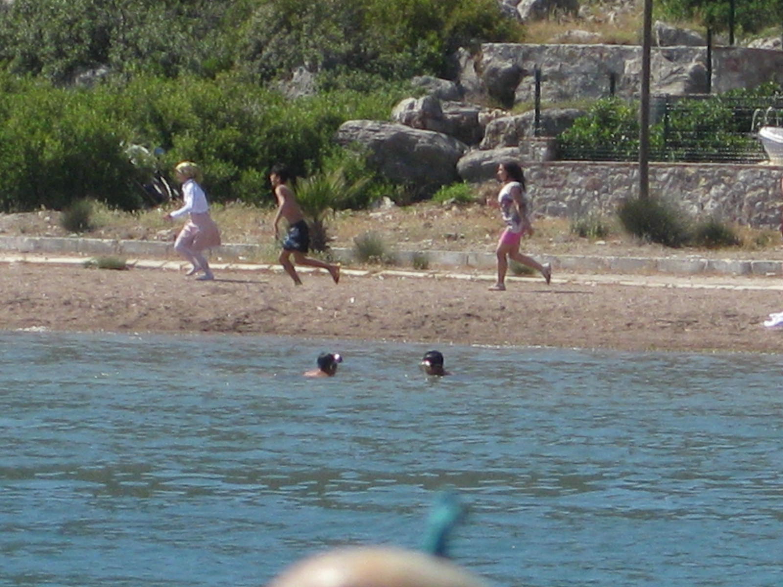 Vor unsrem Ankerplatz weitet sich die Bucht zu einem ganz leeren Sandstrand. Nur am späten Nachmittag kommen manchmal 4-6 junge Leute: Jungs mit Flossen kraulen neugierig zur EOS hin, gut gebaute reizvolle junge Mädchen im knappen (!)Bikini tollen im schultertiefen Wasser, tauchen sich unter, quietschen vor Vergnügen. Einmal war eine ganze Schulklasse (6. oder 7.?) da, alle tobten im Meer oder spielten Fußball und Volleyball am Strand.