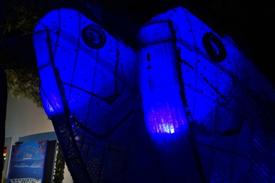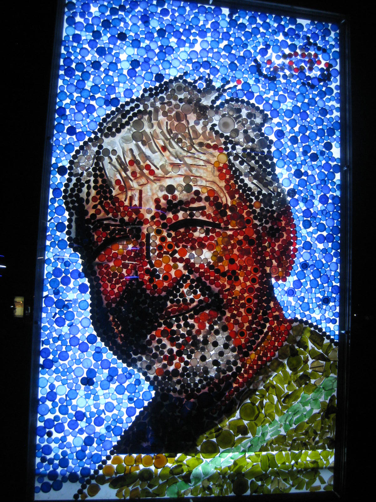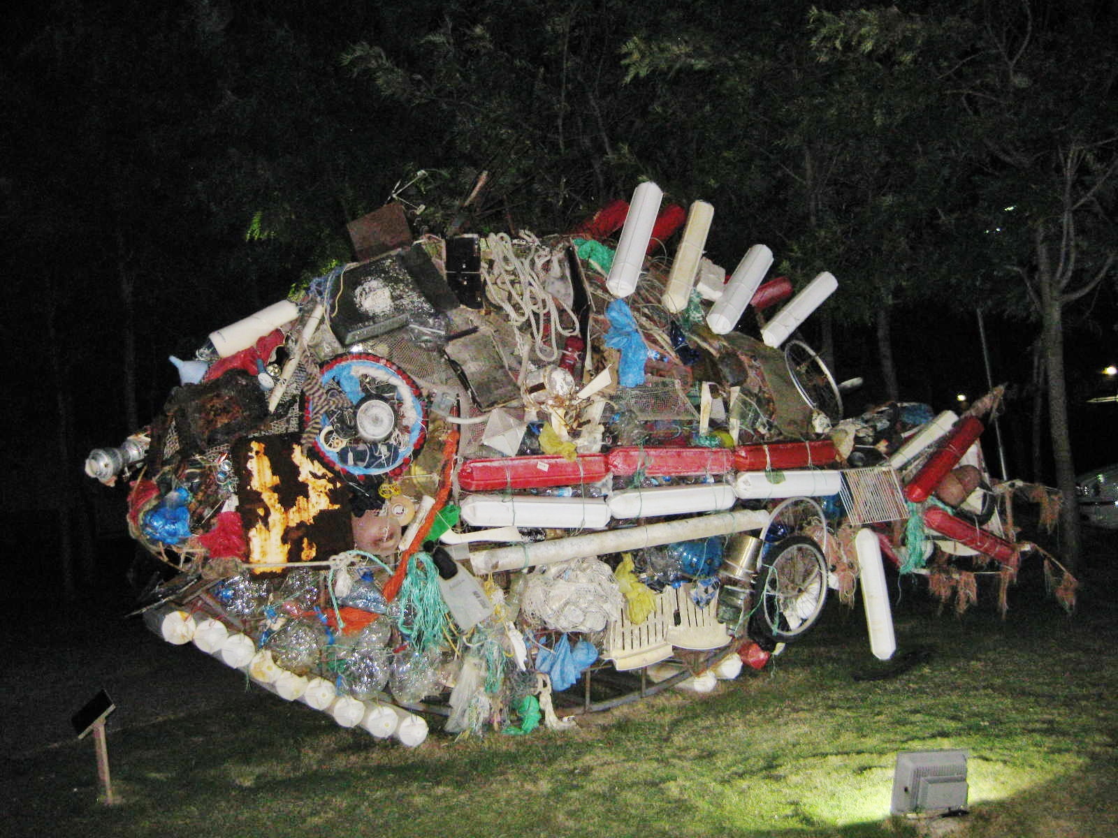 Gleich hinter der Marina mit ihren Bars und feinen Restaurants hat man mit Müll Kunstobjekte geschaffen. Aus Treibgut wurde ein 6m langer und 2 m hoher Fisch geformt. Aus unzähligen leeren Pet-Wasserflaschen, ineineandergeschoben, entstanden zwei Fisch-Torsos, nachts blau von innen beleuchtet. Ein Profilporträt wurde gefügt aus lauter blauen Flaschen-Schraubdeckeln, ein lachendes Gesicht entstand aus roten Flaschenverschlüssen, Kronenkorken und braunen Bierflaschen-Scherben. Die Palmen am Weg sind umringt von blauen und weißen nachts leuchtenden Reifen. Sie erinnern an Martins erstem labbinaer-„Blaue-Nacht“-Kunstobjekt in Nürnberg, der mobile Leuchter aus LED-Licht-Reifen.