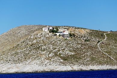 Anderntags stehen wir früh auf, verlassen den feinen Hafen und uns empfängt gleich wieder der Meltimi mit Kraft. Bei den letzten türkischen Inseln reffen wir kräftig und dann liegen die kahlen Berge Griechenlands vor uns mit den Klöstern als Einsprengsel. Keine Bäume mehr.