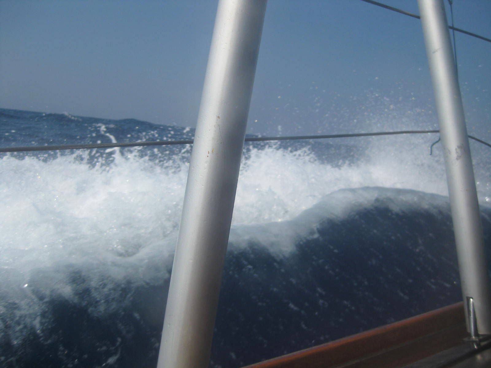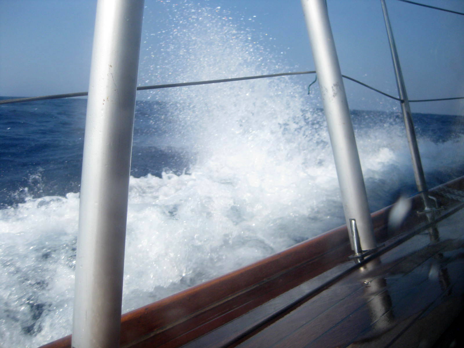 Schräglage, die Eos wird stark gefordert, der Bug knallt in die hohen Wellen und teilt die Wogen, daß es 2-3 m hoch aufspritzt beim Eintauchen… Seitlich Flüsse an Deck, am Heck umkreisen mich Seen und brausen durch die Festmacherklüsen hinaus. Hart am Wind. Insel Levita in Sicht, aber wir können es so nicht erreichen. Innen im Schiff knarzt, ächzt und quietscht es laut, Pfeffermühle, Schere und Tee-Ei spielen hämmernd Schlagzeug, wenn der Bug auf die Wellen knallt…