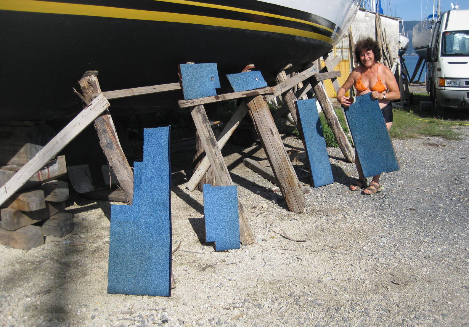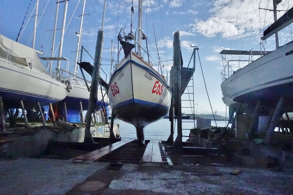 Bis auf das Teakdeck ist EOS in gutem Zustand. Ich habe die Bordwände mit Hull Cleaner und milder Polierpaste gereinigt, gewachst, an Motor und Getriebe das Öl gewechselt, die Filter getauscht und den Impeller der Wasserpumpe auch. Die auf die Bodenbretter aufgeklebten Teppichbeläge haben wir mit Haka-Schmierseife gebürstet und gespült sauber hinterlassen. So „rein“ war die EOS noch nie. EOS ist jetzt mit einer Plane vollkommen abdedeckt und hat den bislang schönsten Winter-Platz in einem Shipyard am Rande von Korfu., mit Blick übers Meer bis nach Sarande-Albanien.