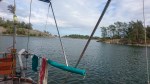 Am Abend beschließen wir, doch zurück zu fahren in einen Hafen von Nynäshamn, um das Segel zur Segelmacherin zu bringen und ein längeres Heckankerseil zu kaufen, damit wir an den Schärenfelsen direkt anlegen können, wie das die Schweden gerne tun. Allerdings haben die am Heck eine flache 30 cm-Rolle mit dem flachen Band, das zum Heckanker führt… Vorne mit Seil an einen Baum an Land oder in einen Ring im Felsen. Originell fand ich zuletzt in Kalnäsviken, daß eine Baumstammscheibe vor einem Bug auf dem Felsen stand. Der war für die Bord-Katze, die da vom Bugkorb aus hinunter springen konnte… damit es nicht gar zu hoch ist, v.a. beim Zurück-an-Bord-Hüpfen:-)