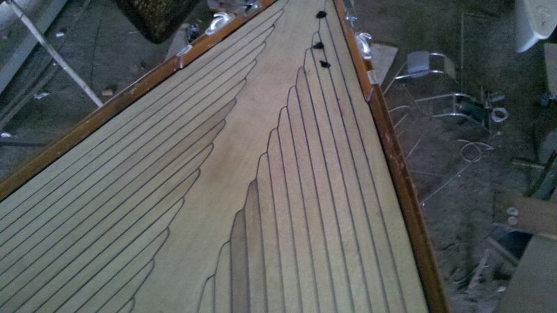Das Teak (Iroko)- Deck ist fertig. Es schaut gut aus. Die innere neue Decken-Verkleidung unter den Fenstern, die wegen zu langer Schrauben notwendig wurde, ist im Salon angebracht. Der „Himmel“ sieht wieder unversehrt aus. Die Plicht wurde mit Sikaflex abgedichtet und muss bis zum Schleifen noch trocknen. Am Lukdeckel wurden die Iroka- Leisten aufgeklebt.