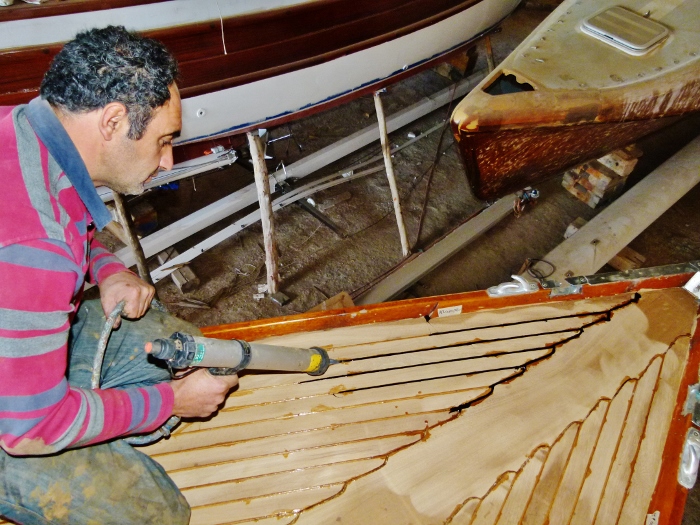 Ein paar Tage später ist plötzlich ein Spant ersetzt, dann eine Planke nach der anderen PASSGENAU eingesetzt und mit wuchtigen Hammerschlägen festgenagelt. Mit dem Elektrohobel abrunden, kalfatern, verspachteln. Erstaunlich schnell wird die kranke Stelle wieder verschlossen. Eine traditionelle, wunderbare, kleine Welt der Arbeit. Als Kunde wär’s mir mit weniger Unordnung viel lieber. Unverständlich für die anderen.