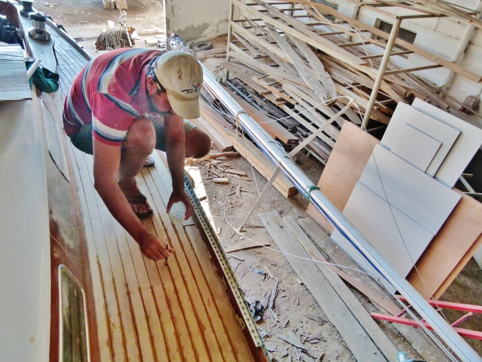 Und das Dreamteam, Nail und Mustafa: Sie bauen mein Teakdeck auf. Es gibt keine Probleme, das Deck wird 1000 Jahre dicht sein und sie sind die absoluten Fachleute. Sie haben auch wirklich was los. Das ruppige Umfeld setzt sich leider auf der EOS fort. Wie kann man nur arbeiten und gleichzeitig so viel reden? ? Türken reden überhaupt gerne, auch über große Entfernungen hinweg.