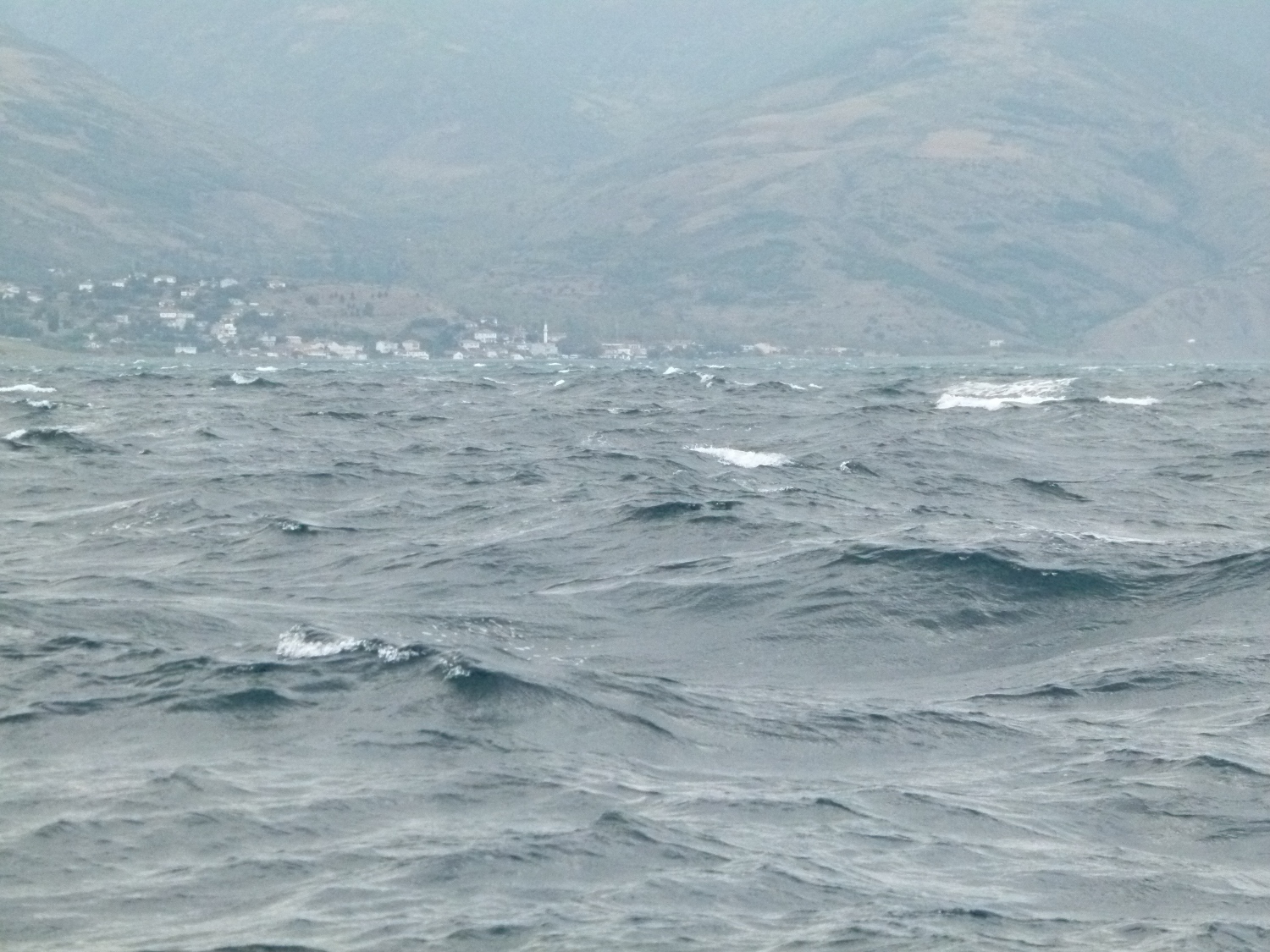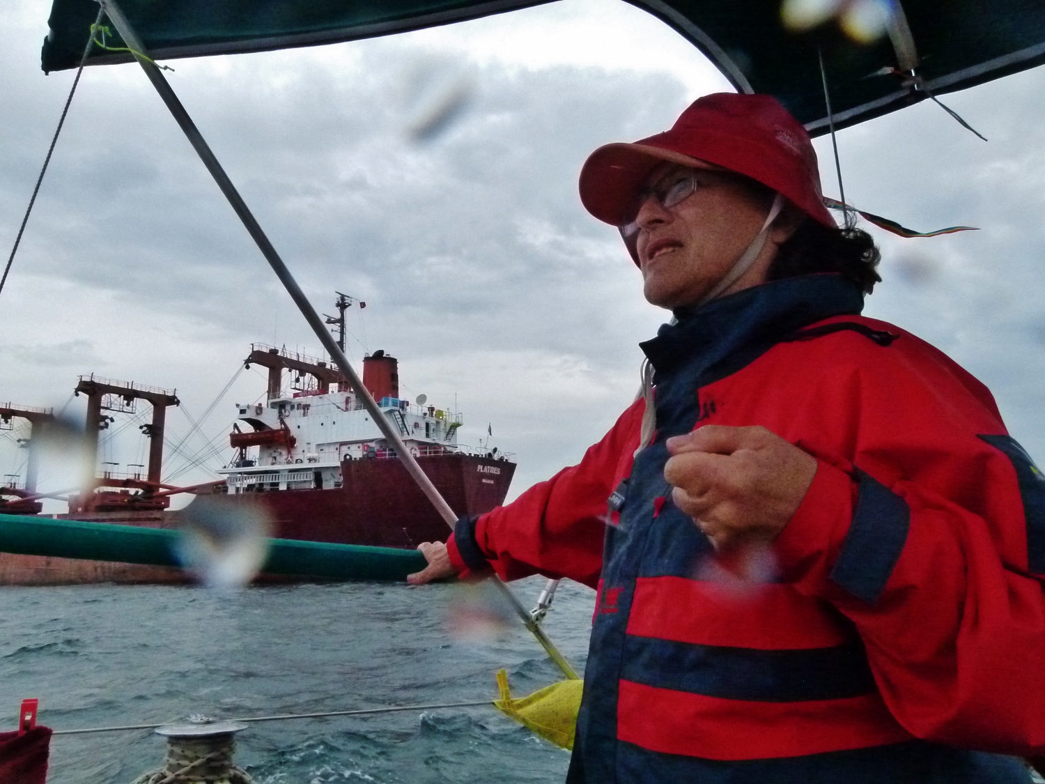 Anderntags holen wir bei wolkenverhangenem Himmel den Anker ein, kehren aber nach 2 Meilen wieder um und ankern ein 2. Mal: Segel gerissen: Gerdi erkennt von der Pinne aus eine geplatzte Naht im Großsegel. Nach einer Stunde Nähen legen wir erneut ab, queren jetzt nochmals den Bosporus, schlagen Haken um mächtige ein- und ausfahrende Frachtschiffe, schlängeln uns zwischen den vielen Ankerliegern durch und erreichen die Nordseite des Marmara- Meeres. Istanbuls Zentrum bleibt zurück und löst sich im Regengrau auf. Nicht aber die Vororte, sie begleiten uns an Land noch stundenlang.
