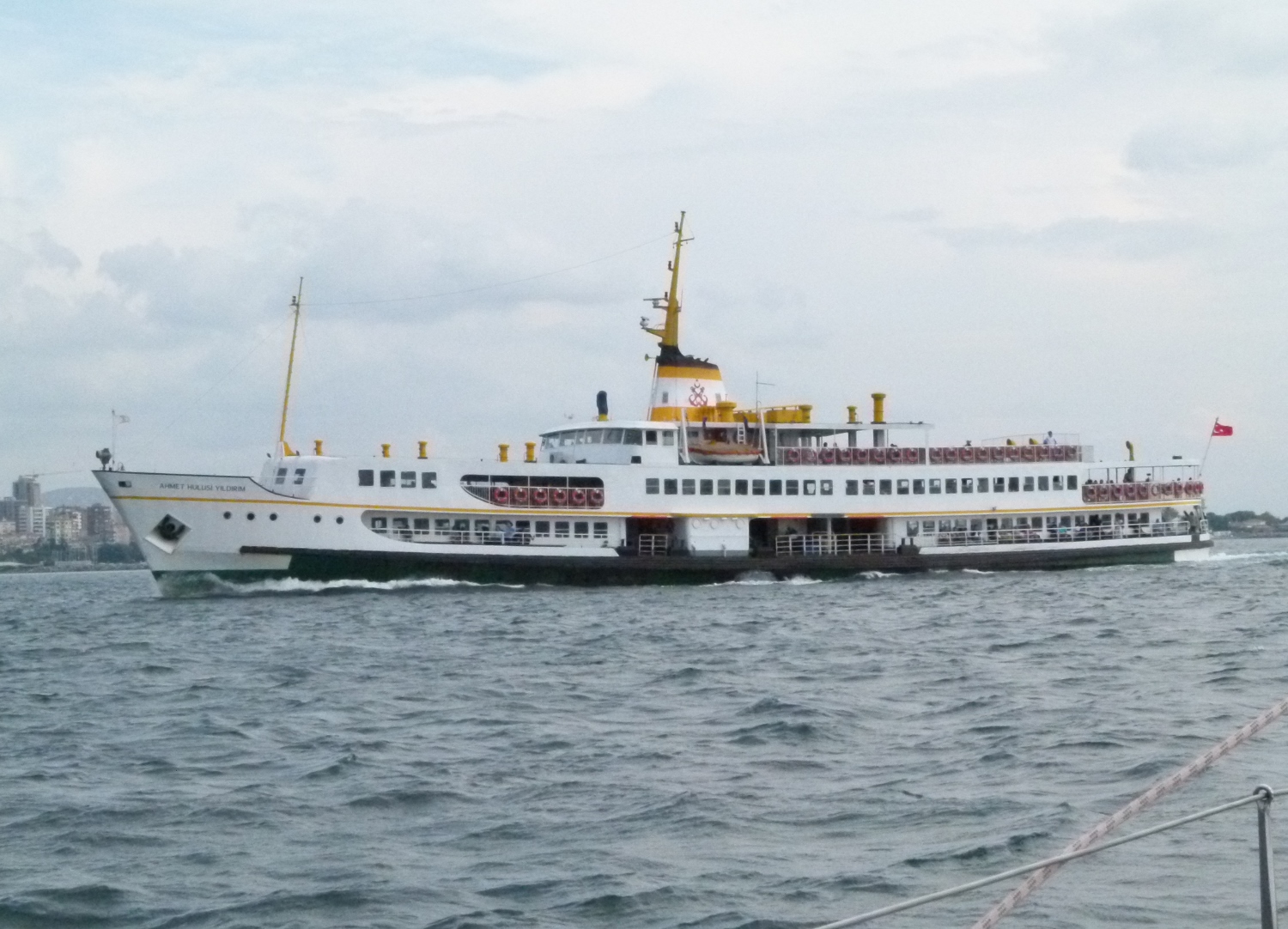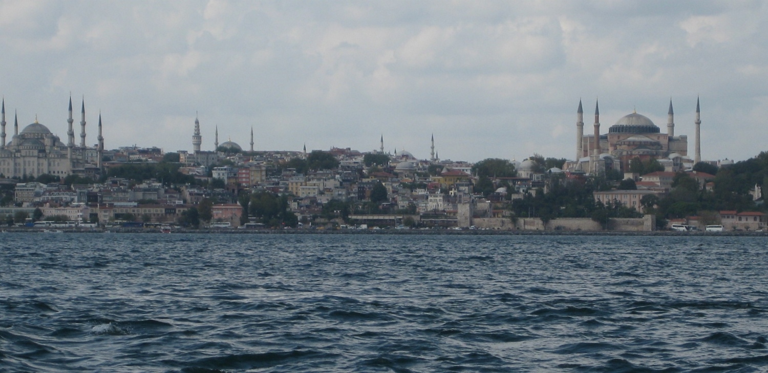 Nach der zweiten Brücke öffnet sich der Blick auf das Zentrum. Keine Rede mehr von einem gemütlichen Ort. Nur Häuser und dahinter klotzige Hochhäuser. Breit wird hier der Bosporus. Viel Wind mit uns, weiße Schaumkronen. Repräsentative Staatsbauten auf beiden Seiten. In der Ferne die Minarette der Aya Sofia Camii und die Kuppel der Blauen Moschee und das Topkapi Sarayi. Rechts neben uns die schöne Ortaköy Chamii, feinst verziert.
