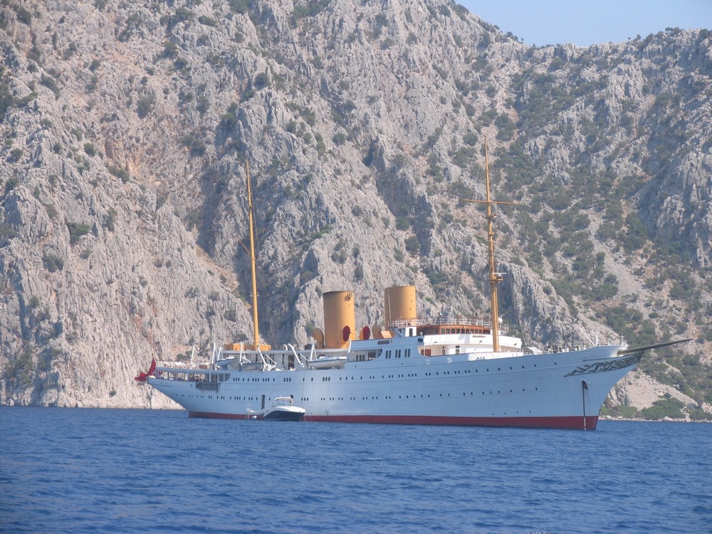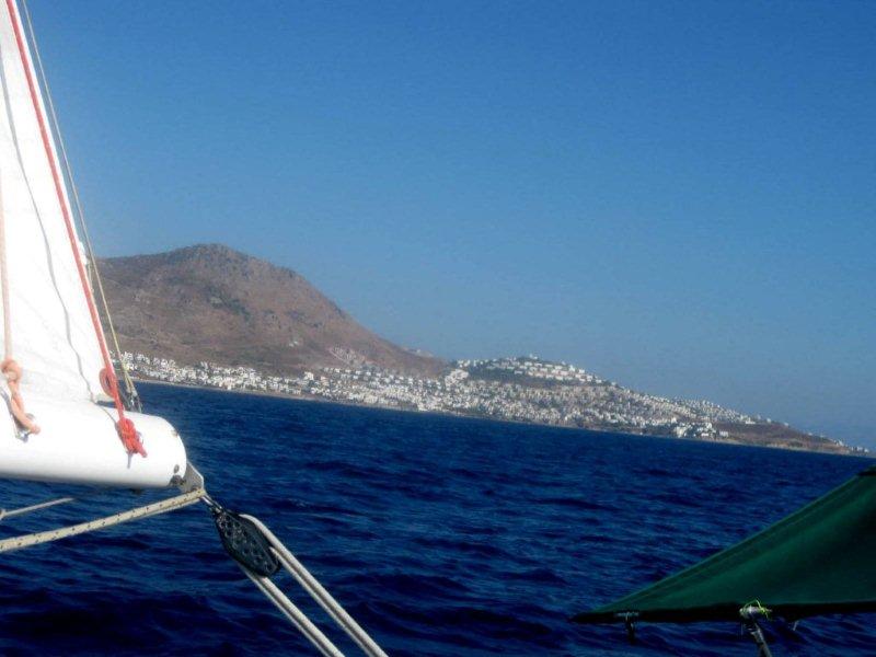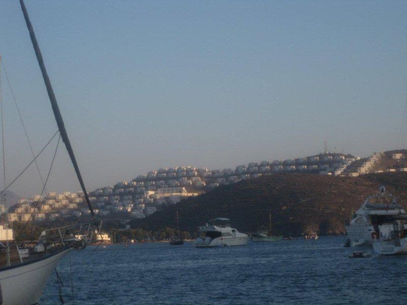 Beim Weitersegeln erschrecken mich so manche Hügel, die dicht mit weißen Ferienhäusern „bebaut“ sind, sie sehen, besonders am Hügelsaum oben, aus wie Grabsteine auf Friedhöfen, oder wie die Stein-Stelen am Holocaust-Denkmal am Brandenburger Tor. Tourismus? Wie Touristen-Büchsen. Legoland ist hübscher. Wir ankern vor dem naturbelassenen romantischen Fischerdorf Gümüslük, wo ein knallroter aufgeblasener kleiner Zeppelin hochgelassen wird und ferngesteuert die archäologischen Fundamente auf der kleine Insel Cavus fotografiert. Das ist querab vom griechischen Kalymnos. Also wohl griechische Geschichte. Früh am Morgen des 30. August schmettert ein Fischer einen gigantisch großen Octopus auf den Fels am Ufer, die Fangarme wohl über 60 cm lang!